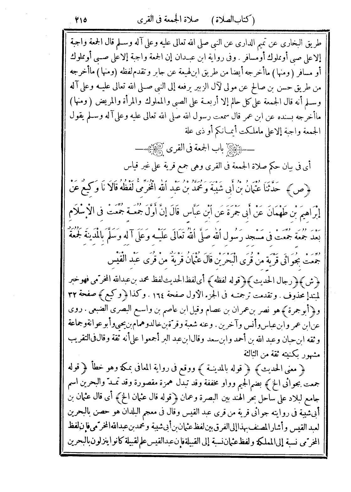 (ص) حَدَّثَنَا عُثْمَانُ بْنُ أَبِي شَيْبَةَ وَمُحَمَّدُ بْنُ عَبْدِ اللَّهِ الْمُخَرِّمِيُّ -لَفْظُهُ- قَالاَ نَا وَكِيعٌ عَنْ إِبْرَاهِيمَ بْنِ طَهْمَانَ عَنْ أَبِي جَمْرَةَ عَنِ ابْنِ عَبَّاسٍ قَالَ إِنَّ أَوَّلَ جُمُعَةٍ جُمِّعَتْ فِي الإِسْلاَمِ بَعْدَ جُمُعَةٍ جُمِّعَتْ فِي مَسْجِدِ رَسُولِ اللَّهِ -صَلَّى الله تَعَالَى عَلَيْهِ وَعَلَى آلِهِ وَسَلَّمَ- بِالْمَدِينَةِ لَجُمُعَةٌ جُمِّعَتْ بِجُوَاثَى قَرْيَةٍ مِنْ قُرَى الْبَحْرَيْنِ. قَالَ عُثْمَانُ قَرْيَةٌ مِنْ قُرَى عَبْدِ الْقَيْسِ.