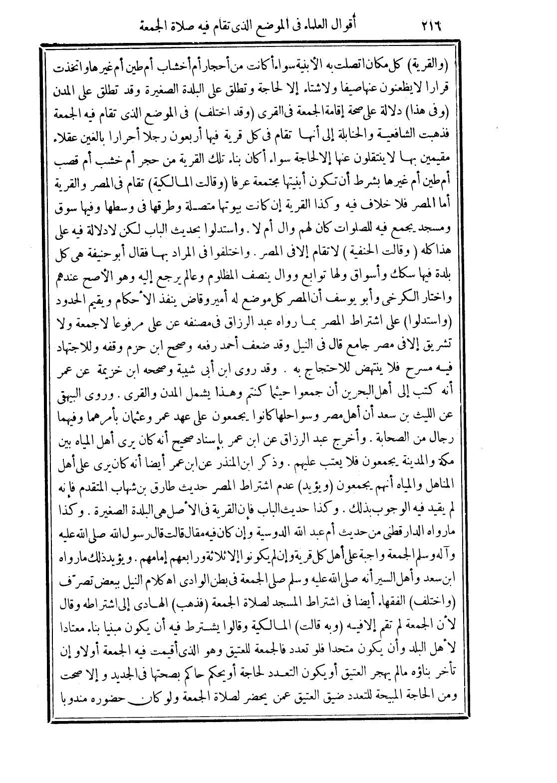 هذا كله. وقالت الحنفية) لا تقام إلا في المصر. واختلفوا في المراد بها فقال أبو حنفية هي كل