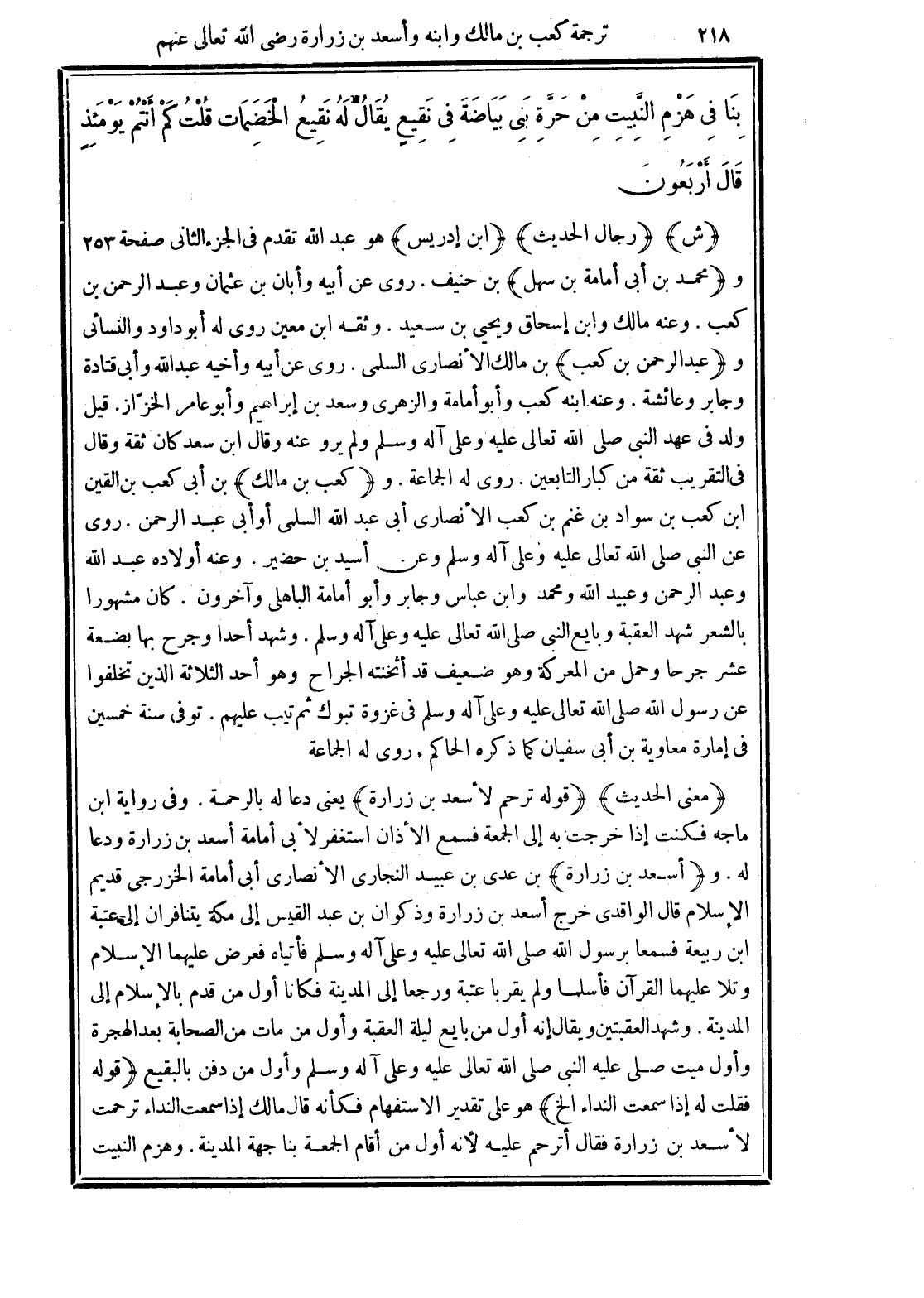 (ش) (رجال الحديث) (ابن إدريس) هو عبد الله تقدم في الجزء الثاني صفحة 253 و (محمد بن أبي أمامة بن سهل) بن حنيف. روى عن أبيه وأبان بن عثمان وعبد الرحمن بن كعب. وعنه مالك وابن إسحاق ويحيى بن سعيد. وثقه ابن معين روى له أبو داود والنسائي و (عبد الرحمن بن كعب) بن مالك الأنصاري السلمي. روى عن أبيه وأخيه عبد الله وأبي قتادة وجابر وعائشة. وعنه ابنه كعب وأبو أمامة والزهري وسعد بن إبراهيم وأبو عامر الخزّاز. قيل ولد في عهد النبي صلى الله تعالى عليه وعلى آله وسلم ولم يرو عنه وقال ابن سعد كان ثقة وقال في التقريب ثقة من كبار التابعين. روى له الجماعة. و (كعب بن مالك) بن أبي كعب بن القين ابن كعب بن سواد بن غنم بن كعب الأنصاري أبي عبد الله السلمي أو أبي عبد الرحمن. روى عن النبي صلى الله تعالى عليه وعلى آله وسلم وعن أسيد بن حضير. وعنه أولاده عبد الله وعبد الرحمن وعبيد الله ومحمد وابن عباس وجابر وأبو أمامة الباهلي وآخرون. كان مشهورًا بالشعر شهد العقبة وبايع النبي صلى الله تعالى عليه وعلى آله وسلم. وشهد أحدًا وجرح بها بضعة عشر جرحًا وحمل من المعركة وهو ضعيف قد أثخنته الجراح وهو أحد الثلاثة الذين تخلفوا عن رسول الله صلى الله تعالى عليه وعلى آله وسلم في غزوة تبوك ثم تيب عليهم. توفي سنة خمسين في إمارة معاوية بن أبي سفيان كما ذكره الحاكم روى له الجماعة