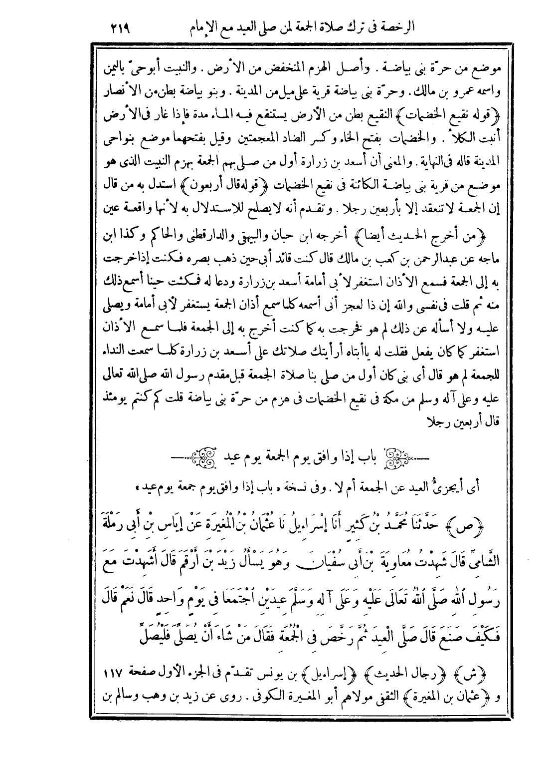 (ص) حَدَّثَنَا مُحَمَّدُ بْنُ كَثِيرٍ أَنَا إِسْرَائِيلُ نَا عُثْمَانُ بْنُ الْمُغِيرَةِ عَنْ إِيَاسِ بْنِ أَبِي رَمْلَةَ الشَّامِيِّ قَالَ شَهِدْتُ مُعَاوِيَةَ بْنَ أَبِي سُفْيَانَ وَهُوَ يَسْأَلُ زَيْدَ بْنَ أَرْقَمَ قَالَ أَشَهِدْتَ مَعَ رَسُولِ اللهِ -صَلَّى الله تَعَالَى عَلَيْهِ وَعَلَى آلِهِ وَسَلَّمَ- عِيدَيْنِ اجْتَمَعَا في يَوْمٍ قَالَ نَعَمْ. قَالَ فَكَيْفَ صَنَعَ قَالَ صَلَّى الْعِيدَ ثُمَّ رَخَّصَ في الْجُمُعَةِ فَقَالَ "مَنْ شَاءَ أَنْ يُصَلِّيَ فَلْيُصَلِّ".