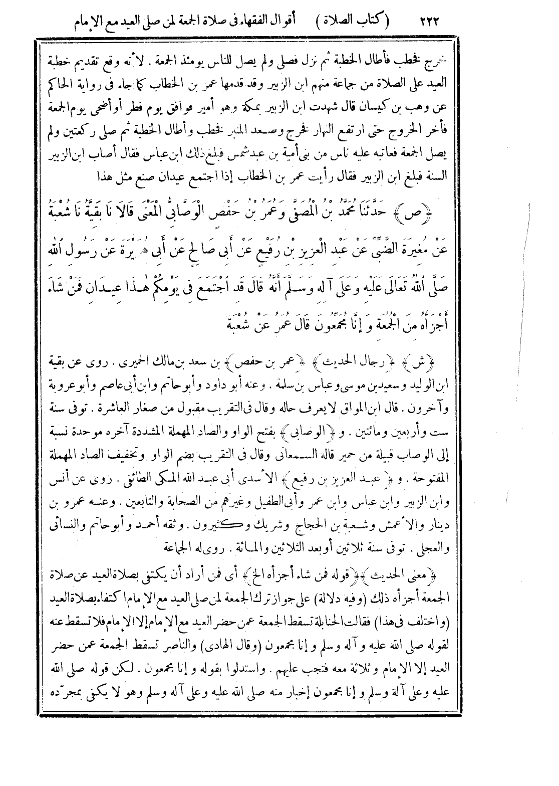 (ش) (رجال الحديث) (عمر بن حفص) بن سعد بن مالك الحميري. روي عن بقية ابن الوليد وسعيد بن موسى وعباس بن سلمه. وعنه أبو داود وأبو حاتم وابن أبي عاصم وأبو عروبة آخرون. قال ابن المواق لا يعرف حاله وقال في التقريب مقبول من صغار العاشرة. توفي سنة ست وأربعين ومائتين. و (الوصابي) بفتح الواو والصاد المهملة المشددة آخر موحدة نسبة إلى الوصاب قبيلة من حمير قاله السمعاني وقال في التقريب بضم الواو وتخفيف الصاد المهملة المفتوحة. و (عبد العزيز بن رفيع) الأسدي أبي عبد الله المكي الطائفي. روي عن أنس وابن الزبير وابن عباس وابن عمر وأبي الطفيل وغيرهم من الصحابة والتابعين. وعنه عمرو بن دينار والأعمش وشعبة بن الحجاج وشريك وكثيرون. وثقة أحمد وأبو حاتم والنسائي والعجلي. توفي سنة ثلاثين أو بعد الثلاثين والمائه. روي له الجماعة
