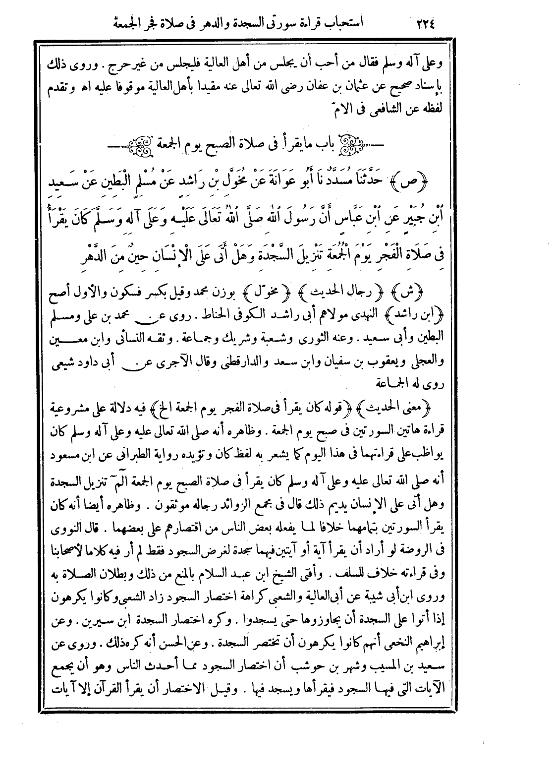 (ص) حَدَّثَنَا مُسَدَّدٌ نَا أَبُو عَوَانَةَ عَنْ مُخَوَّلِ بْنِ رَاشِدٍ عَنْ مُسْلِمٍ الْبَطِينِ عَنْ سَعِيدِ بْنِ جُبَيْرٍ عَنِ ابْنِ عَبَّاسٍ أَنَّ رَسُولَ اللَّهِ -صَلَّى الله تَعَالَى عَلَيْهِ وَعَلَى آلِهِ وَسَلَّمَ- كَانَ يَقْرَأُ فِي صَلاَةِ الْفَجْرِ يَوْمَ الْجُمُعَةِ تَنْزِيلَ السَّجْدَةِ وَ (هَلْ أَتَي عَلَي الْإِنْسَانِ حِينٌ مِنَ الدَّهْرِ).