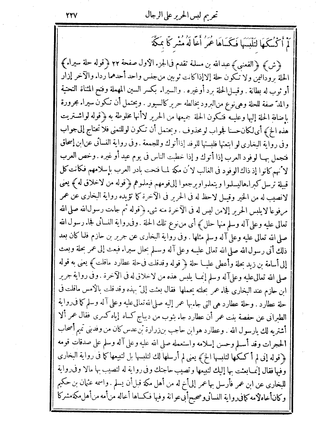(قوله حلة سيراء) الحلة برود اليمن ولا تكون حلة إلا إذا كانت ثوبين من جنس واحد أحدهما رداء والآخر إزار أو ثوب له بطانة. وقيل الحلة برد أو غيره. والسيراء بكسر السين المهملة وفتح المثناة التحتية والمدّ صفة للحلة وهي نوع من البرود يخالطه حرير كالسيور. ويحتمل أن تكون سيراء مجرورة بإضافة الحلة إليها وعليه فتكون الحلة جميعها من الحرير لأنها مخلوطة به