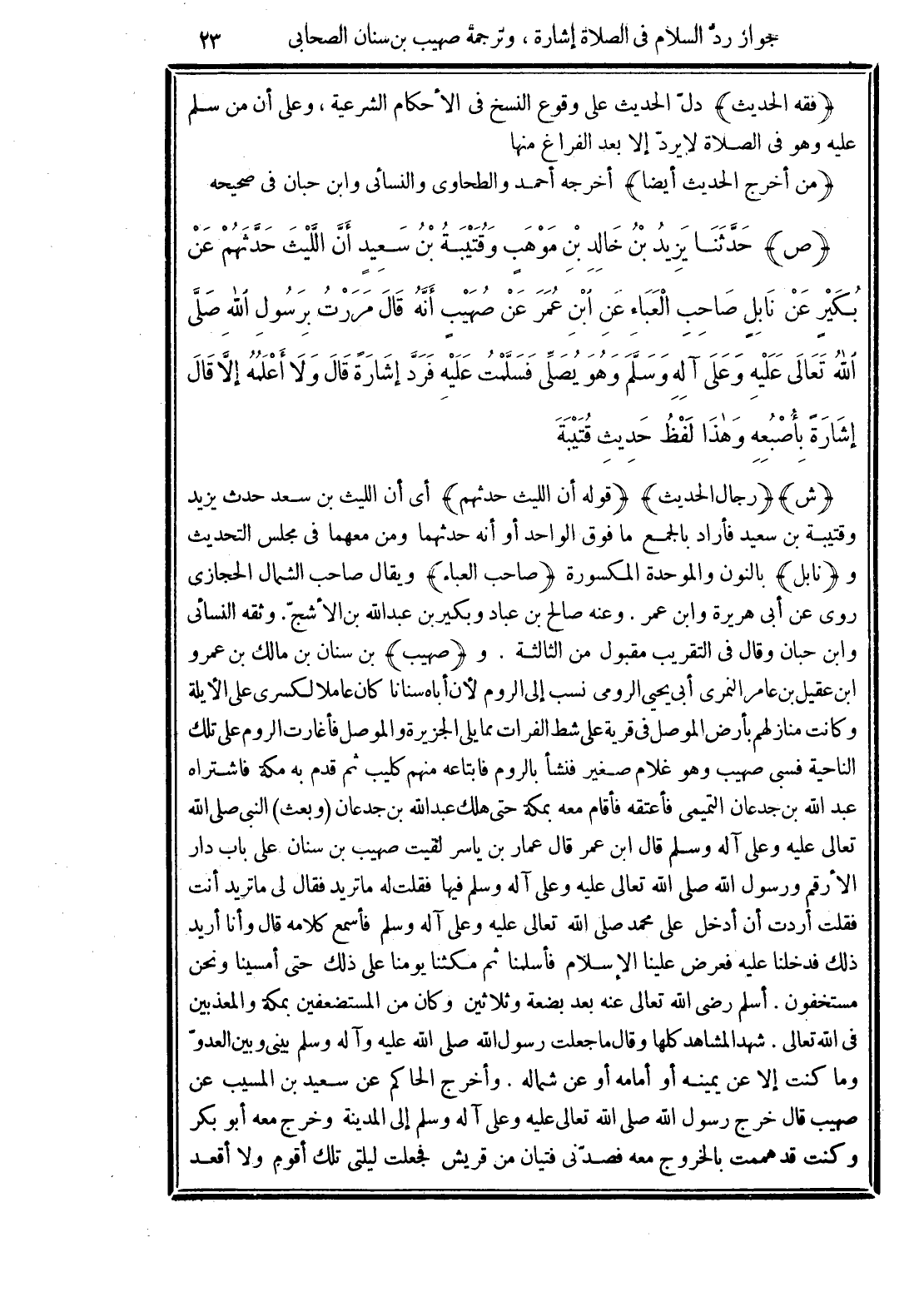 (ص) حَدَّثَنَا يَزِيدُ بْنُ خَالِدِ بْنِ مَوْهَبٍ وَقُتَيْبَةُ بْنُ سَعِيدٍ أَنَّ اللَّيْثَ حَدَّثَهُمْ عَنْ بُكَيْرٍ عَنْ نَابِلٍ صَاحِبِ الْعَبَاءِ عَنِ ابْنِ عُمَرَ عَنْ صُهَيْبٍ أَنَّهُ قَالَ مَرَرْتُ بِرَسُولِ اللَّهِ -صلى الله عليه وسلم- وَهُوَ يُصَلِّي فَسَلَّمْتُ عَلَيْهِ فَرَدَّ إِشَارَةً. قَالَ وَلاَ أَعْلَمُهُ إِلاَّ قَالَ إِشَارَةً بِأُصْبُعِهِ وَهَذَا لَفْظُ حَدِيثِ قُتَيْبَةَ.