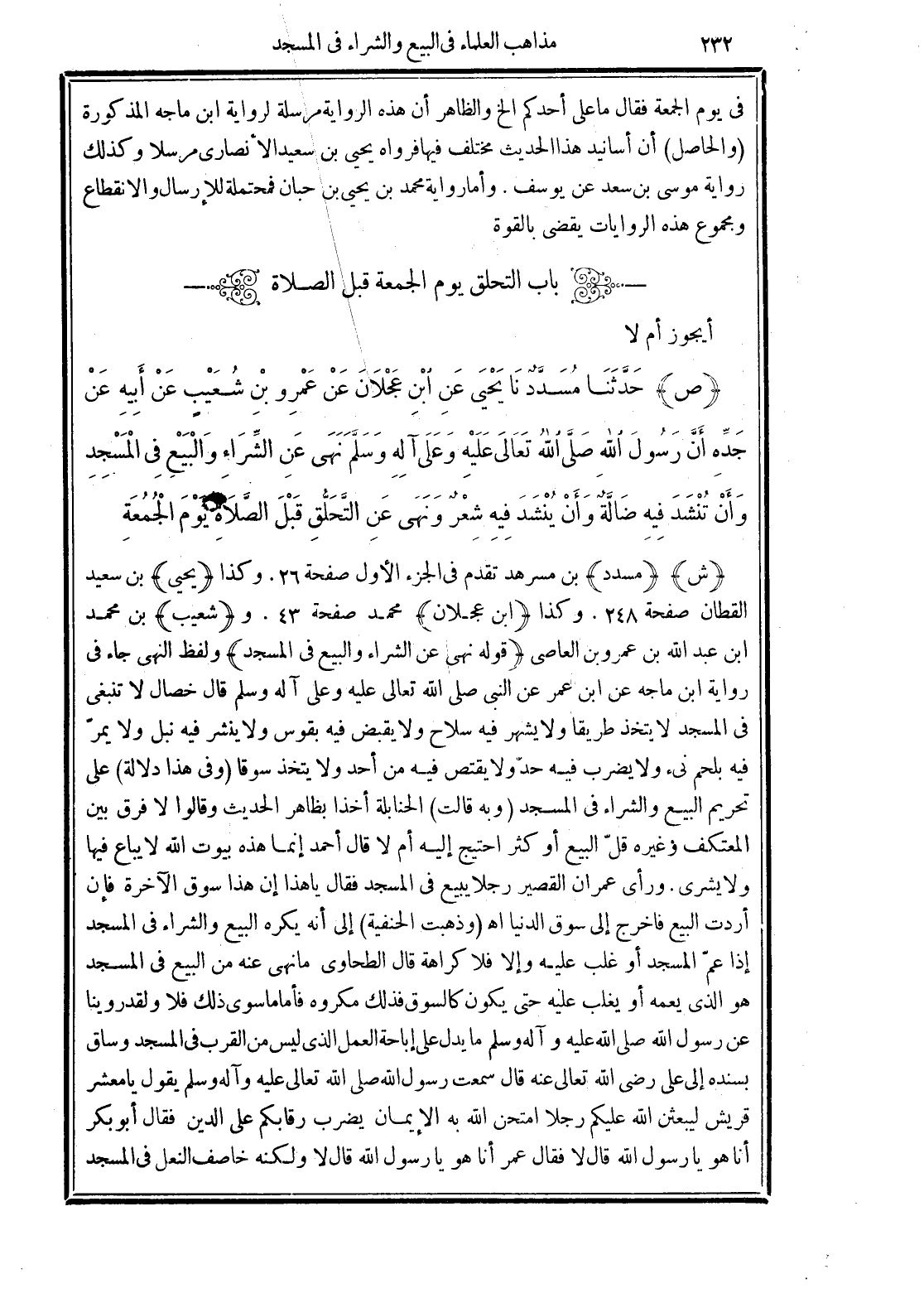 (ص) حَدَّثَنَا مُسَدَّدٌ نَا يَحْيَى عَنِ ابْنِ عَجْلاَنَ عَنْ عَمْرِو بْنِ شُعَيْبٍ عَنْ أَبِيهِ عَنْ جَدِّهِ أَنَّ رَسُولَ اللَّهِ -صَلَّى الله تَعَالَى عَلَيْهِ وَعَلَى آلِهِ وَسَلَّمَ- نَهَى عَنِ الشِّرَاءِ وَالْبَيْعِ فِى الْمَسْجِدِ وَأَنْ تُنْشَدَ فِيهِ ضَالَّةٌ وَأَنْ يُنْشَدَ فِيهِ شِعْرٌ وَنَهَى عَنِ التَّحَلُّقِ قَبْلَ الصَّلاَةِ يَوْمَ الْجُمُعَةِ.