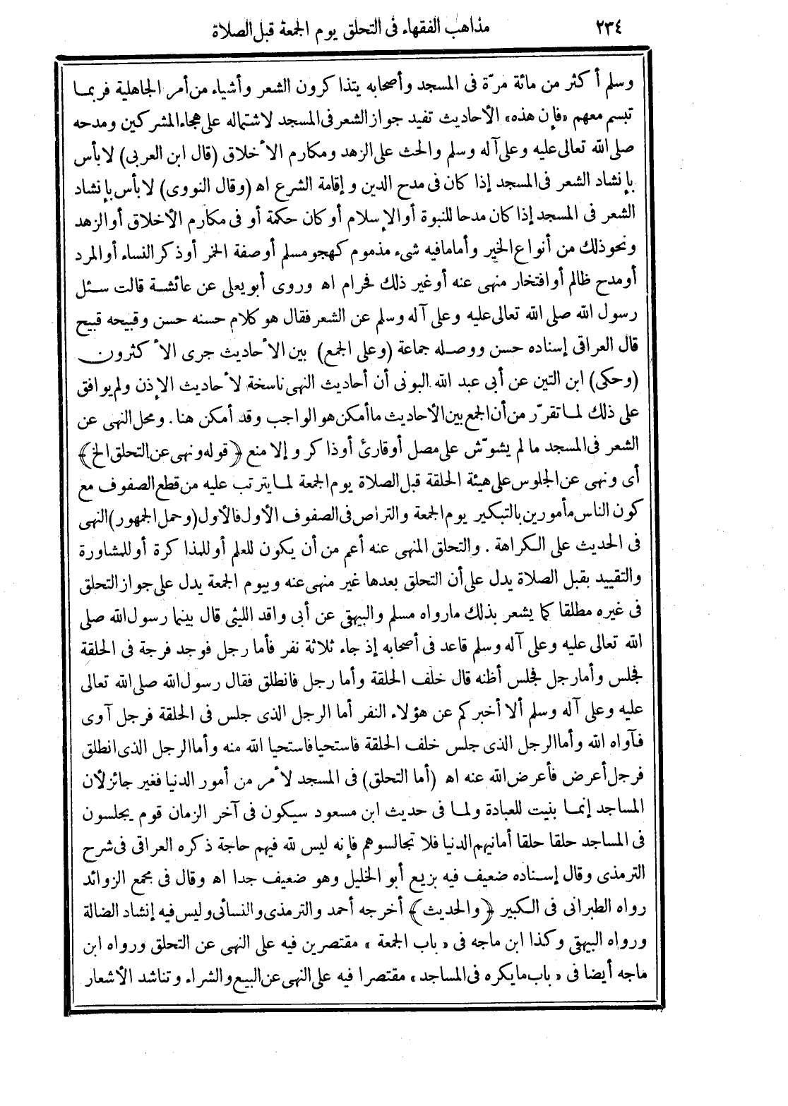 (والحديث) أخرجه أحمد والترمذي والنسائي وليس فيه إنشاد الضالة ورواه البيهقي وكذا ابن ماجه في "باب الجمعة" مقتصرين فيه على النهي عن التعليق ورواه ابن ماجه أيضًا في "باب ما يكره في المساجد" مقتصرًا فيه على النهي عن البيع والشراء وتناشد الأشعار