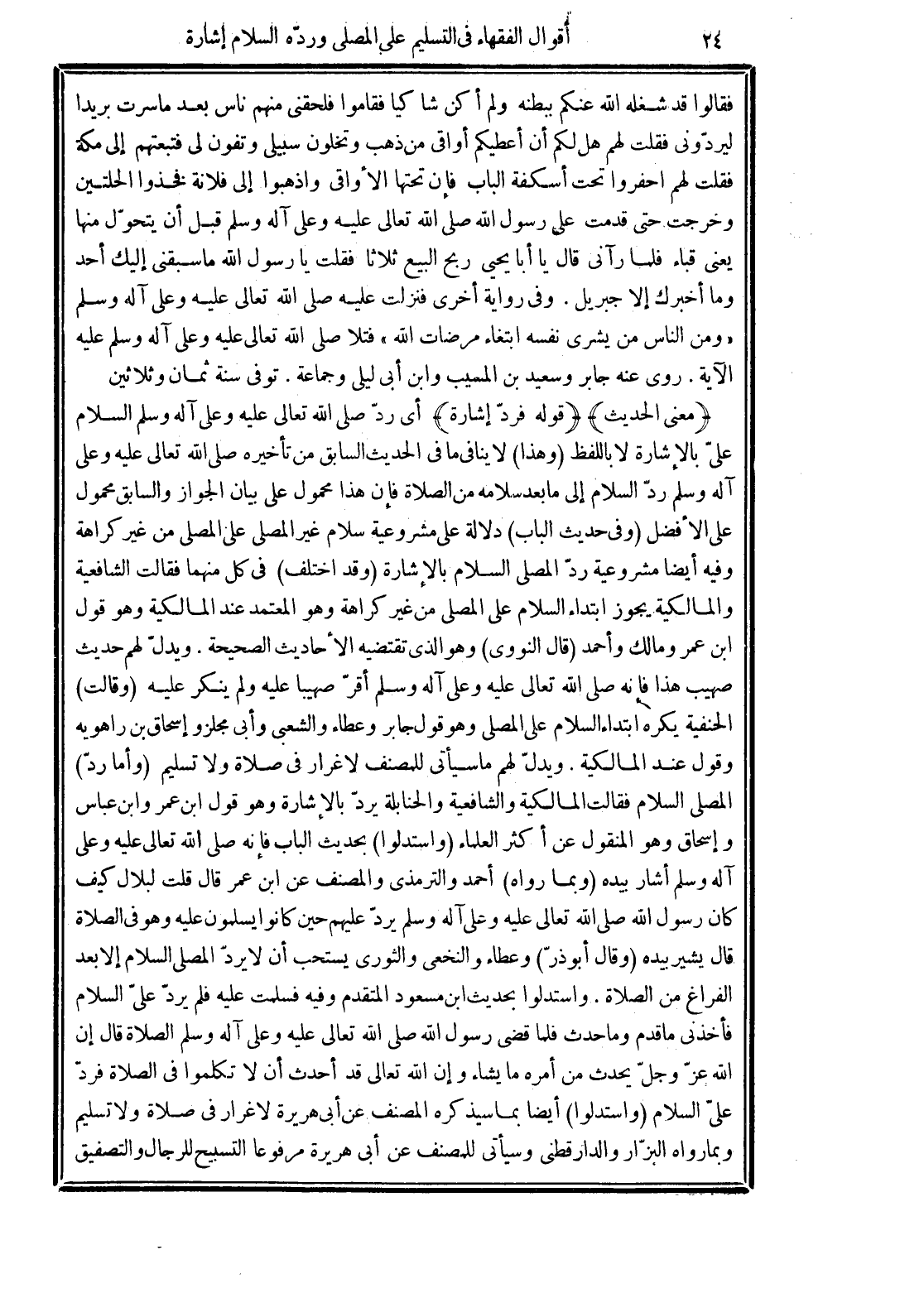 (وأما ردّ) المصلي السلام فقالت المالكية والشافعية والحنابلة يردّ بالإشارة وهو قول ابن عمر وابن عباس وإسحاق وهو المنقول عن أكثر العلماء