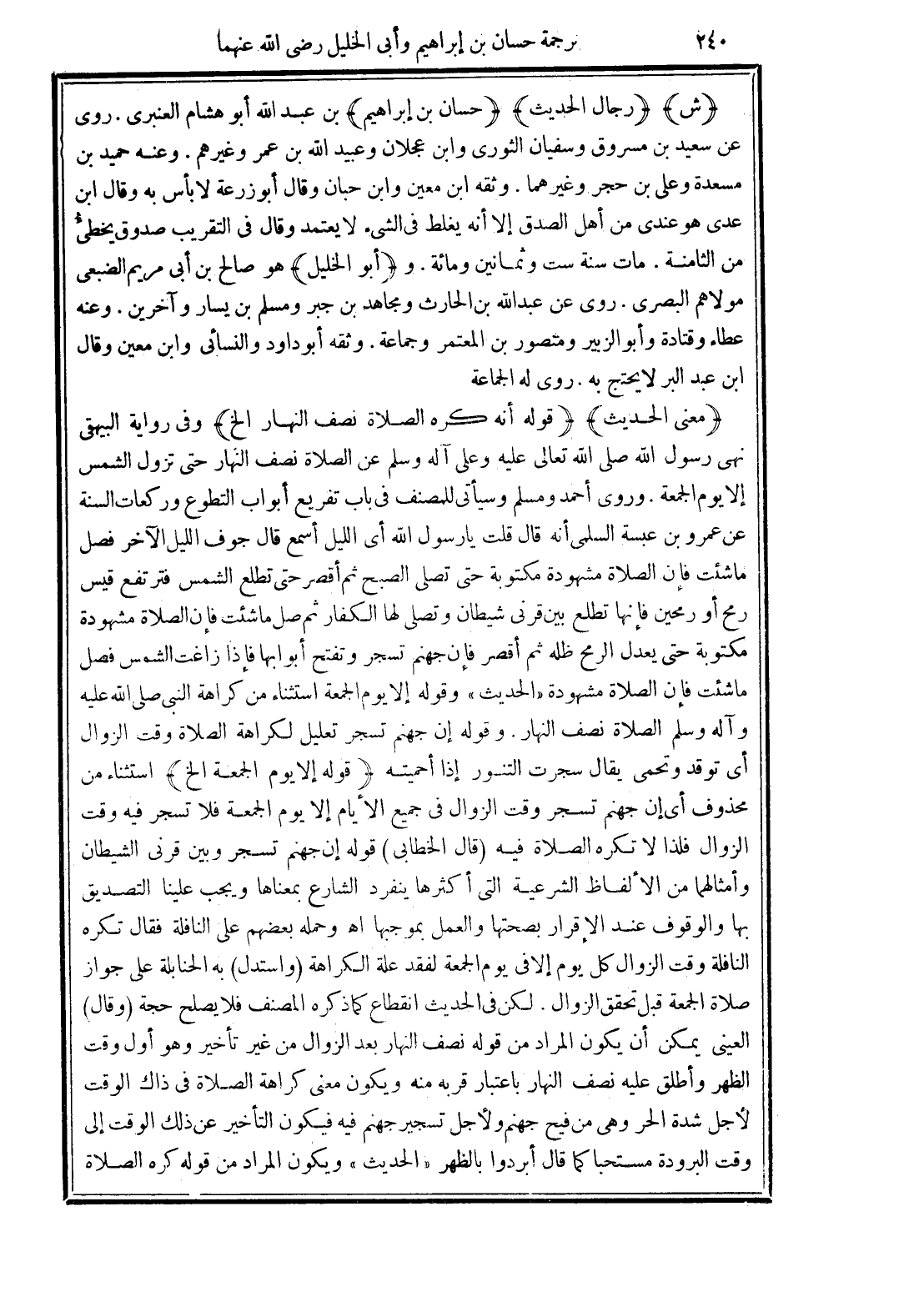 (قوله أنه كره الصلاة نصف النهار الخ) وفي رواية البيهقي نهى رسول الله صلى الله تعالى عليه وعلى آله وسلم عن الصلاة نصف النهار حتى تزول الشمس إلايوم الجمعة. وروي أحمد ومسلم وسيأتي للصنف في باب تفريع أبواب التطوع وركعات السنة عن عمرو بن عبسة السلمي أنه قال قلت يا رسول الله أي الليل أسمع قال جوف الليل الآخر فصل ما شئت فإن الصلاة مشهودة مكتوبة حتى تصلي الصبح ثم أقصر حتى تطلع الشمس فترتفع قيس رمح أو رمحين فإنها تطلع بين قرني شيطان وتصلي لها الكفار ثم صل ماشئت فإن الصلاة مشهودة مكتوبة حتى يعدل الرمح ظله ثم أقصر فإن جهنم تسجر وتفتح أبوابها فإذا زاغت الشمس فصل ما شئت فإن الصلاة مشهودة "الحديث" وقوله إلا يوم الجمعة استثناء من كراهة النبي صلى الله عليه وآله وسلم الصلاة نصف النهار. وقوله إن جهنم تسجر تعليل لكراهة الصلاة وقت الزوال أي توقد وتحمي يقال سجرت التنور إذا أحميته