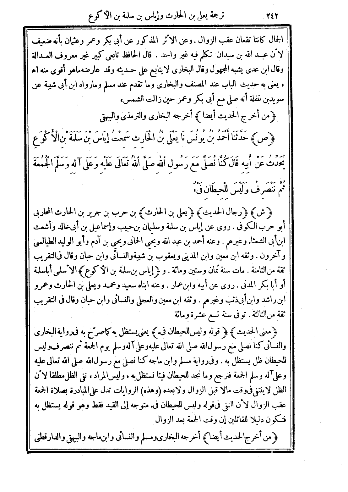 (ص) حَدَّثَنَا أَحْمَدُ بْنُ يُونُسَ نَا يَعْلَى بْنُ الْحَارِثِ سَمِعْتُ إِيَاسَ بْنَ سَلَمَةَ بْنِ الأَكْوَعِ يُحَدِّثُ عَنْ أَبِيهِ قَالَ كُنَّا نُصَلِّي مَعَ رَسُولِ اللَّهِ -صَلَّى الله تَعَالَى عَلَيْهِ وَعَلَى آلِهِ وَسَلَّمَ- الْجُمُعَةَ ثُمَّ نَنْصَرِفُ وَلَيْسَ لِلْحِيطَانِ فَيْءٌ.