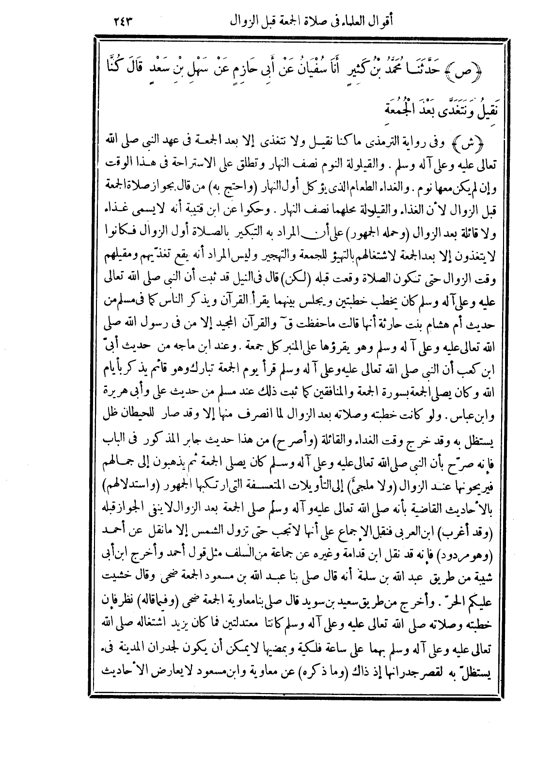 (ص) حَدَّثَنَا مُحَمَّدُ بْنُ كَثِيرٍ أَنَا سُفْيَانُ عَنْ أَبِي حَازِمٍ عَنْ سَهْلِ بْنِ سَعْدٍ قَالَ كُنَّا نَقِيلُ وَنَتَغَدَّى بَعْدَ الْجُمُعَةِ.