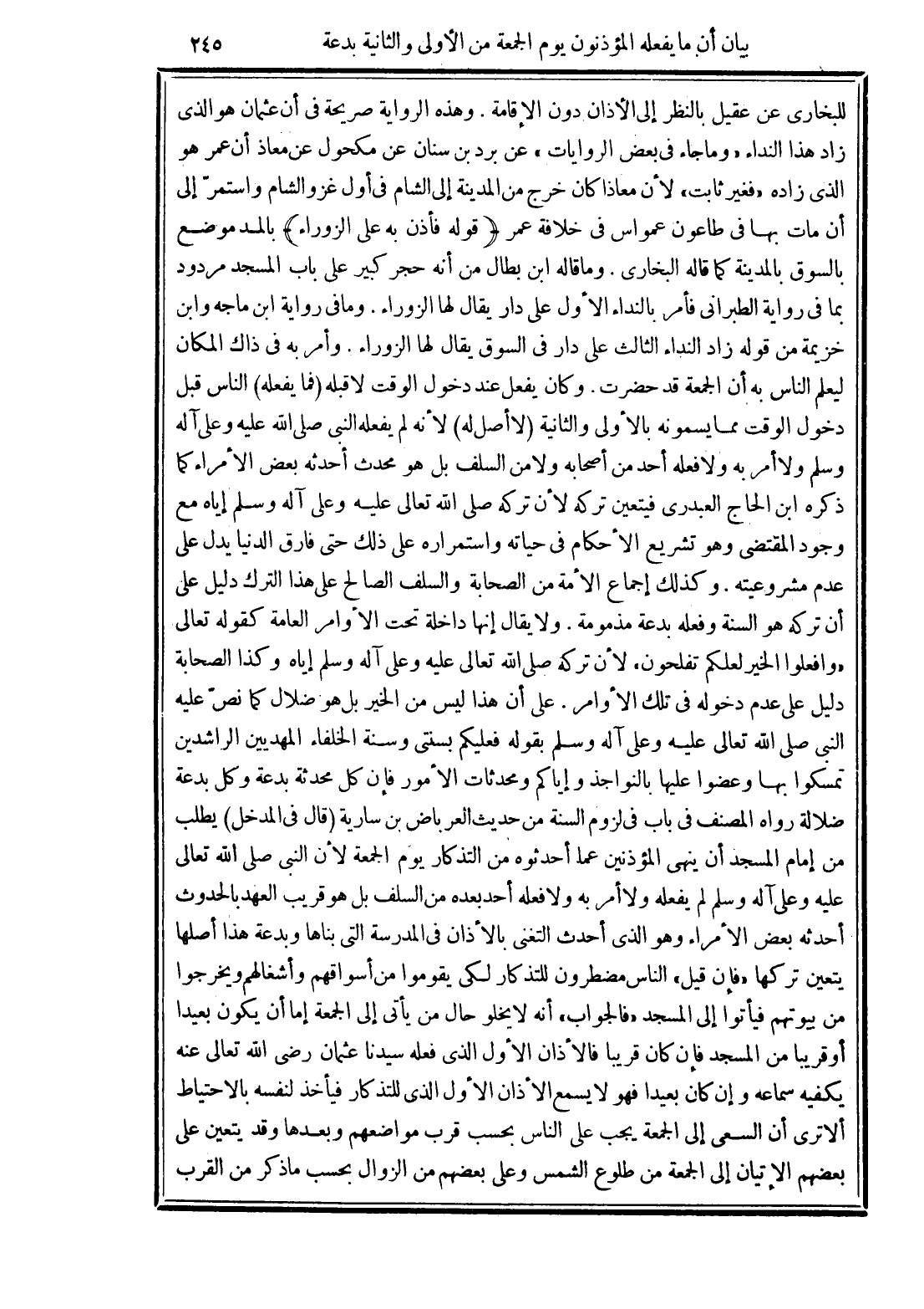(قوله فأذن به على الزوراء) بالمد موضع بالسوق بالمدينة كما قاله البخاري. وما قاله ابن بطال من أنه حجر كبير على باب المسجد مردود بما في رواية الطبراني فأمر بالنداء الأول على دار يقال لها الزوراء. ومافي رواية ابن ماجه وابن خزيمة من قوله زاد النداء الثالث على دار في السوق يقال لها الزوراء. وأمر به في ذاك المكان ليعلم الناس به أن الجمعة قد حضرت. وكان يفعل عند دخول الوقت لا قبله (فما يفعله) الناس قبل دخول الوقت مما يسمونه بالأولي والثانية (لا أصل له) لأنه لم يفعله النبي صلى الله تعالى عليه وعلى آله وسلم ولا أمر به ولا فعله أحد من أصحابه ولا من السلف بل هو محدث أحدثه بعض الأمراء كما ذكره ابن الحاج العبدري فيتعين تركه لأن تركه صلى الله تعالى عليه وعلى آله وسلم إياه مع وجود المقتضي وهو تشريع الأحكام في حياته واستمراره على ذلك حتى فارق الدنيا يدل على عدم مشروعيته. وكذلك إجماع الأمة من الصحابة والسلف الصالح على هذا الترك دليل على أن تركه هو السنة وفعله بدعة مذمومة. ولا يقال إنها داخلة تحت الأوامر العامة كقوله تعالى (وَافْعَلُوا الْخَيْرَ لَعَلَّكُمْ تُفْلِحُونَ) لأن تركه صلى الله تعالى عليه وعلى آله وسلم إياه وكذا الصحابة دليل على عدم دخوله في تلك الأوامر. على أن هذا ليس من الخير بل هو ضلال كما نصّ عليه النبي صلى الله تعالى عليه وعلى آله وسلم بقوله فعليكم بسنتي وسنة الخلفاء المهديين الراشدين تمسكوا بها وعضوا عليها بالنواجذ وإياكم ومحدثات الأمور فإن كل محدثة بدعة وكل بدعة ضلالة رواه المصنف في باب في لزوم السنة من حديث العرباض بن سارية (قال في المدخل) يطلب من إمام المسجد أن ينهى المؤذنين عما أحدثوه من التذكار يوم الجمعة لأن النبي صلى الله تعالى عليه وعلى آله وسلم لم يفعله ولا أمر به ولا فعله أحد بعده من السلف بل هو قريب العهد بالحدوث أحدثه بعض الأمراء وهو الذي أحدث التغني بالأذان في المدرسة التي بناها وبدعة هذا أصلها يتعين تركها "فإن قيل" الناس مضطرون للتذكار لكي يقوموا من أسواقهم وأشغالهم ويخرجوا من بيوتهم فيأتوا إلى المسجد "فالجواب" أنه لا يخلو سأل من يأتي إلى الجمعة إما أن يكون بعيدًا أو قريبًا من المسجد وفإن كان قريبًا فالأذان الأول الذي فعله سيدنا عثمان رضي الله تعالى عنه يكفيه سماعه وإن كات بعيدًا فهو لا يسمع الأذان الأول الذي للتذكار فيأخذ لنفسه بالاحتياط ألا تري أن السعي إلى الجمعة يجب على الناس بحسب قرب مواضعهم وبعدها وقد يتعين على بعضهم الإتيان إلى الجمعة من طلوع الشمس وعلى بعضهم من الزوال بحسب ما ذكر من القرب
