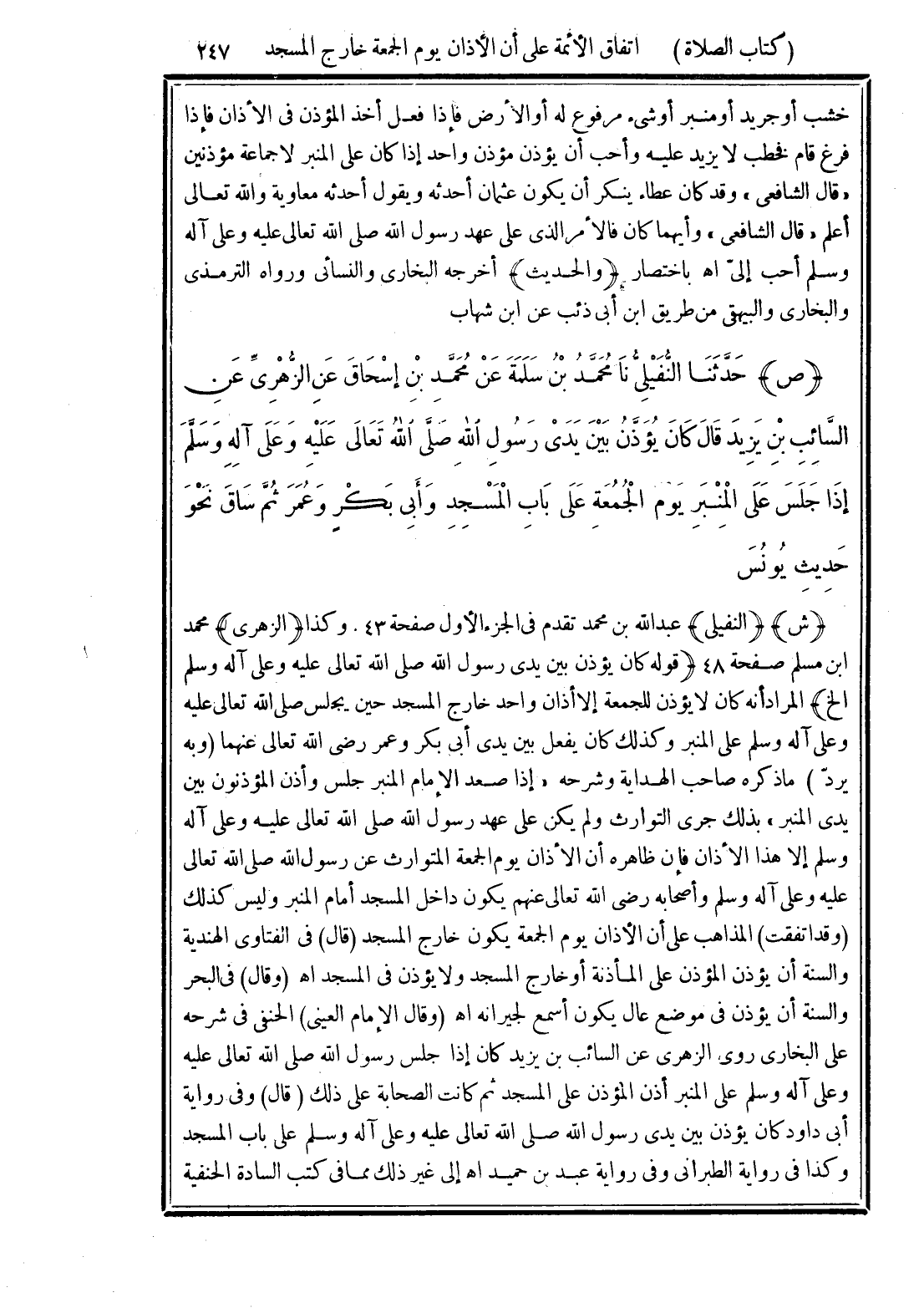 (وقال الإِمام العيني) الحنفي في شرحه على البخاري روى الزهري عن السائب بن يزيد كان إذا جلس رسول الله صلى الله تعالى عليه وعلى آله وسلم على المنبر أذن المؤذن على المسجد ثم كانت الصحابة على ذلك (قال) وفي رواية أبي داود كان يؤذن بين يدي رسول الله صلى الله تعالى عليه وعلى آله وسلم على باب المسجد وكذا في رواية الطبراني وفي رواية عبد بن حميد اهـ إلى غير ذلك مما في كتب السادة الحنفية
