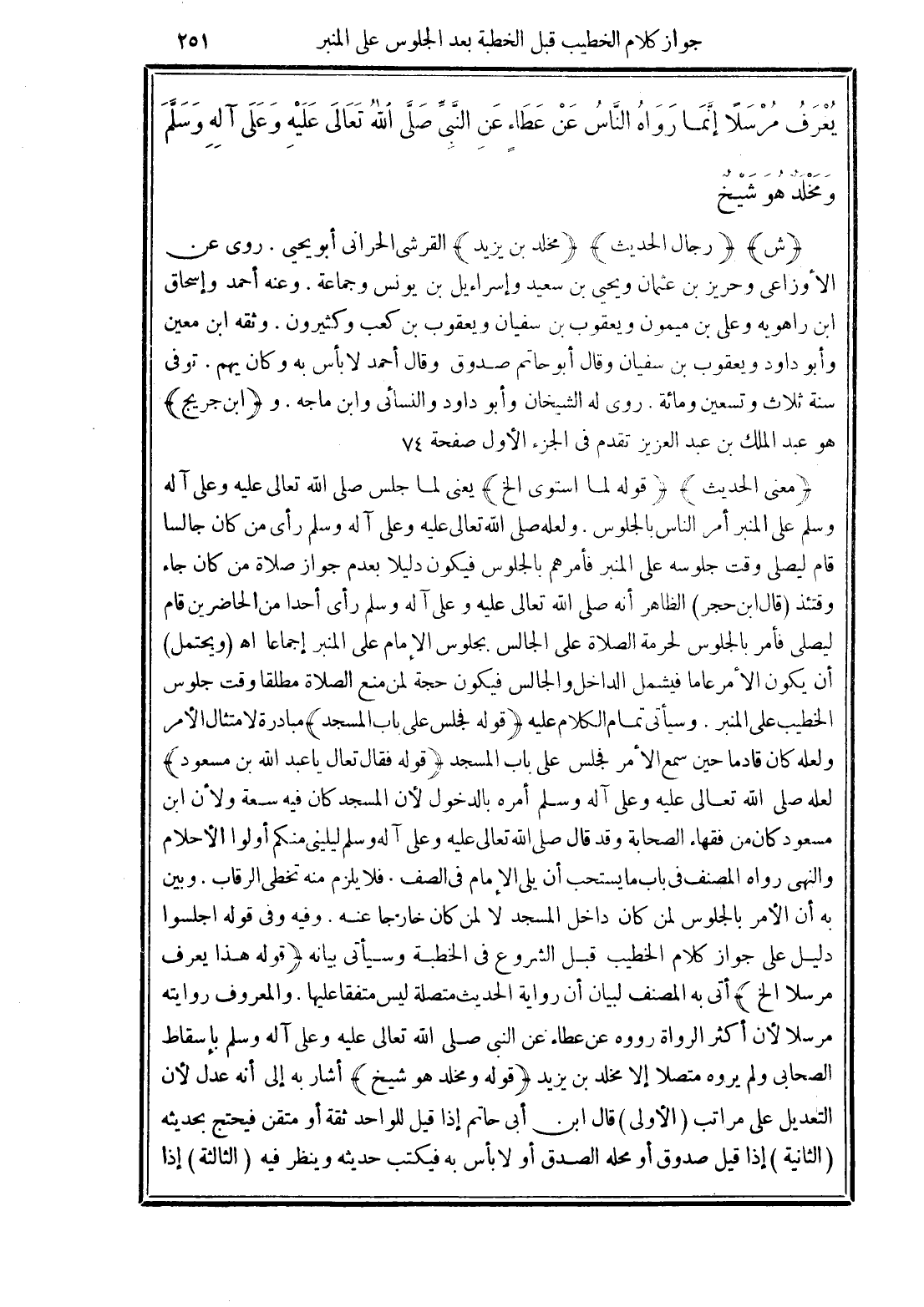 (قوله ومخلد هو شيخ) أشار به إلى أنه عدل لأن التعديل على مراتب (الأولى) قال ابن أبي حاتم إذا قيل للواحد ثقة أو متقن فيحتج بحديثه (الثانية) إذا قيل صدوق أو محله الصدق أو لا بأس به فيكتب حديثه وينظر فيه (الثالثة) إذا