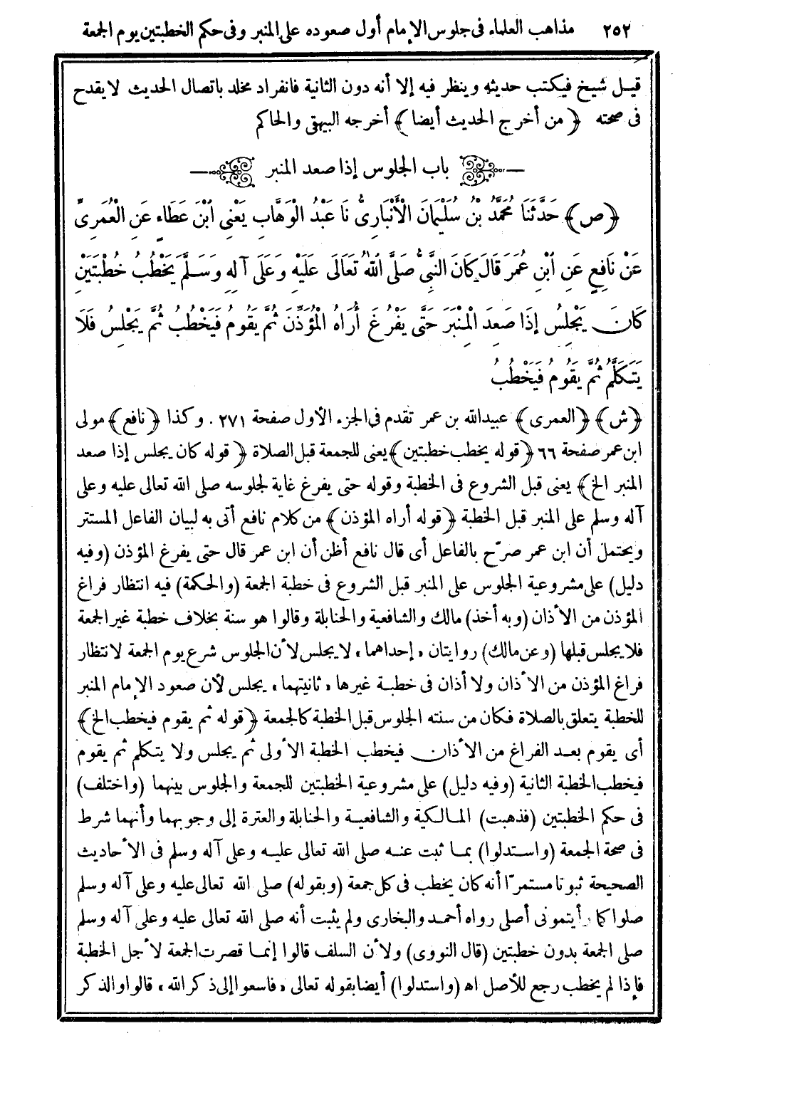 (ص) حَدَّثَنَا مُحَمَّدُ بْنُ سُلَيْمَانَ الأَنْبَارِيُّ نَا عَبْدُ الْوَهَّابِ -يَعْنِي ابْنَ عَطَاءٍ- عَنِ الْعُمَرِيِّ عَنْ نَافِعٍ عَنِ ابْنِ عُمَرَ قَالَ كَانَ النَّبِيُّ -صَلَّى الله تَعَالَى عَلَيْهِ وَعَلَى آلِهِ وَسَلَّمَ- يَخْطُبُ خُطْبَتَيْنِ كَانَ يَجْلِسُ إِذَا صَعِدَ الْمِنْبَرَ حَتَّى يَفْرُغَ -أُرَاهُ قَالَ الْمُؤَذِّنُ- ثُمَّ يَقُومُ فَيَخْطُبُ ثُمَّ يَجْلِسُ فَلاَ يَتَكَلَّمُ ثُمَّ يَقُومُ فَيَخْطُبُ.