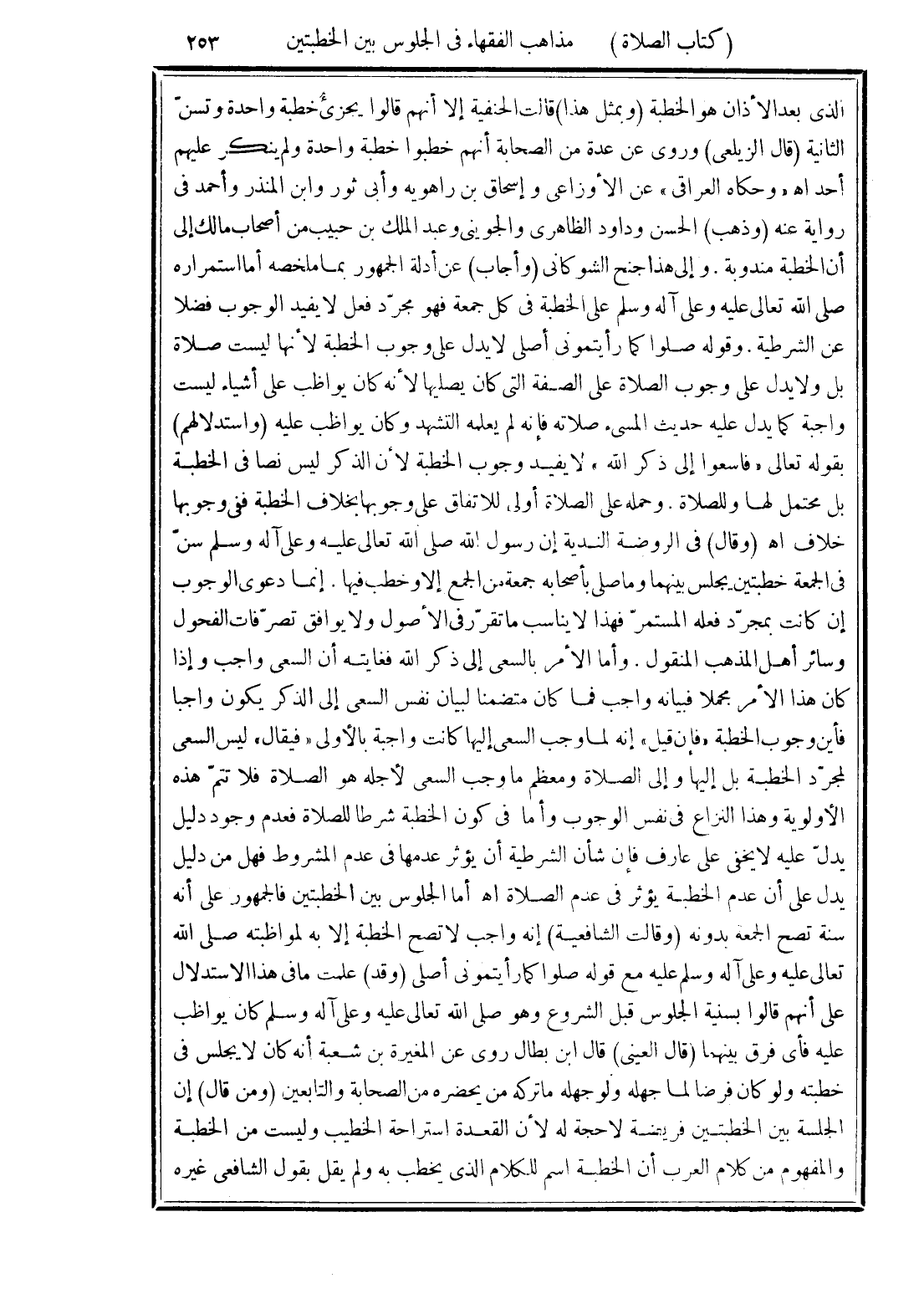 (وقال) في الروضة الندية إن رسول الله صلى الله تعالى عليه وعلى آله وسلم سنّ في الجمعة خطبتين يجلس بينهما وما صلى بأصحابه جمعة من الجمع إلا وخطب فيها. إنما دعوى الوجوب إن كانت بمجرّد فعله المستمرّ فهذا لا يناسب ما تقرّر في الأصول ولا يوافق تصرّفات الفحول وسائر أهل المذهب المنقول. وأما الأمر بالسعي إلى ذكر الله فغايته أن السعي واجب وإذا كان هذا الأمر مجملًا فبيانه واجب فما كان متضمنًا لبيان نفس السعي إلى الذكر يكون واجبًا فأين وجوب الخطبة