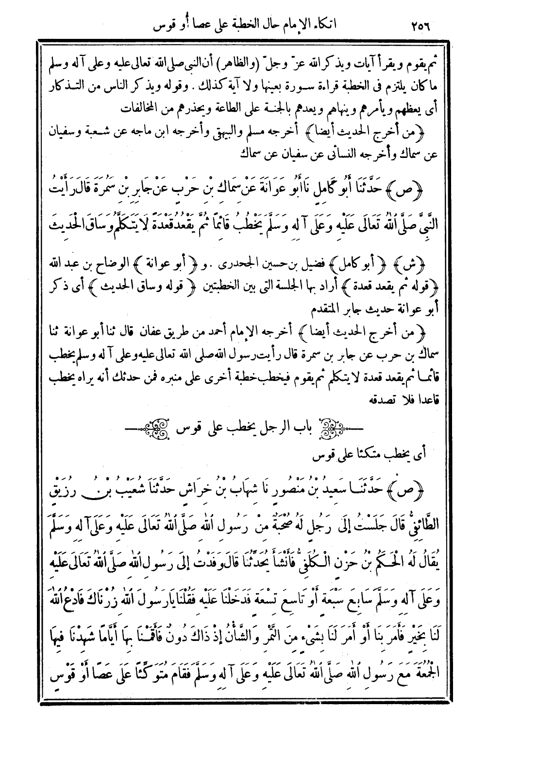(ص) حَدَّثَنَا أَبُو كَامِلٍ نَا أَبُو عَوَانَةَ عَنْ سِمَاكِ بْنِ حَرْبٍ عَنْ جَابِرِ بْنِ سَمُرَةَ قَالَ رَأَيْتُ النَّبِيَّ -صَلَّى الله تَعَالَى عَلَيْهِ وَعَلَى آلِهِ وَسَلَّمَ- يَخْطُبُ قَائِمًا ثُمَّ يَقْعُدُ قَعْدَةً لاَ يَتَكَلَّمُ. وَسَاقَ الْحَدِيثَ.