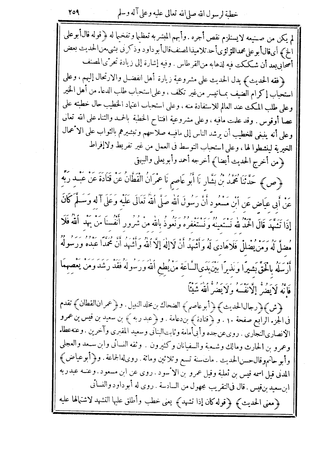 (ص) حَدَّثَنَا مُحَمَّدُ بْنُ بَشَّارٍ نَا أَبُو عَاصِمٍ نَا عِمْرَانُ عَنْ قَتَادَةَ عَنْ عَبْدِ رَبِّهِ عَنْ أَبِي عِيَاضٍ عَنِ ابْنِ مَسْعُودٍ أَنَّ رَسُولَ اللهِ -صَلَّى الله تَعَالَى عَلَيْهِ وَعَلَى آلِهِ وَسَلَّمَ- كَانَ إِذَا تَشَهَّدَ قَالَ "الْحَمْدُ لِلَّهِ نَسْتَعِينُهُ وَنَسْتَغْفِرُهُ وَنَعُوذُ بِاللهِ مِنْ شُرُورِ أَنْفُسِنَا مَنْ يَهْدِهِ الله فَلاَ مُضِلَّ لَهُ وَمَنْ يُضْلِلْ فَلاَ هَادِيَ لَهُ وَأَشْهَدُ أَنْ لاَ إِلَهَ إِلاَّ الله وَأَشْهَدُ أَنَّ مُحَمَّدًا عَبْدُهُ وَرَسُولُهُ أَرْسَلَهُ بِالْحَقِّ بَشِيرًا وَنَذِيرًا بَيْنَ يَدَيِ السَّاعَةِ مَنْ يُطِعِ اللهَ وَرَسُولَهُ فَقَدْ رَشَدَ وَمَنْ يَعْصِهِمَا فَإِنَّهُ لاَ يَضُرُّ إِلاَّ نَفْسَهُ وَلاَ يَضُرُّ اللهَ شَيْئًا".