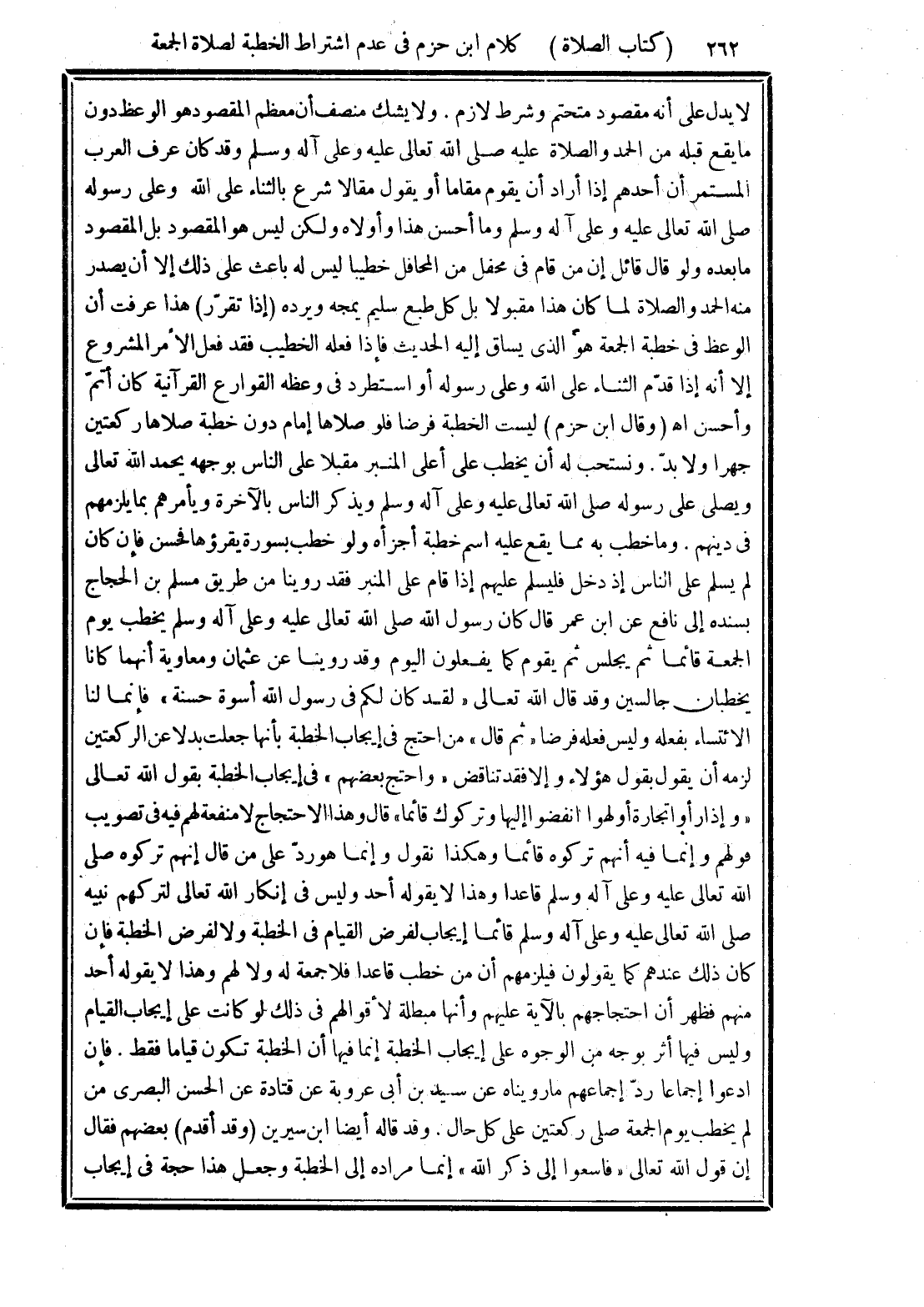 "واحتج بعضهم" في إيجاب الخطبة بقول الله تعالى (وَإِذَا رَأَوْا تِجَارَةً أَوْ لَهْ وَا انْفَضُّوا إِلَيْهَا وَتَرَكُوكَ قَائِمًا) قال وهذا الاحتجاج لا منفعة لهم فيه في تصويب قولهم وإنما فيه أنهم تركوه قائمًا وهكذا نقول وإنما هو ردّ على من قال إنهم تركوه صلى الله تعالى عليه وعلى آله وسلم قاعدًا وهذا لا يقوله أحد وليس في إنكار الله تعالى لتركهم نبيه صلى الله تعالى عليه وعلى آله وسلم قائمًا إيجاب لفرض القيام في الخطبة ولا لفرض الخطبة فإن كان ذلك عندهم كما يقولون فيلزمهم أن من خطب قاعدًا فلا جمعة له ولا لهم وهذا لا يقوله أحد منهم فظهر أن احتجاجهم بالآية عليهم وأنها مبطلة لأقوالهم في ذلك لو كانت على إيجاب القيام وليس فيها أثر بوجه من الوجوه على إيجاب الخطبة إنما فيها أن الخطبة تكون قيامًا فقط. فإن ادعوا إجماعًا ردّ إجماعةم ما رويناه عن سيد بن أبي عروبة عن قتادة عن الحسن البصري من لم يخطب يوم الجمعة صلى ركعتين على كل حال. وقد قاله أيضًا ابن سيرين (وقد أقدم) بعضهم فقال إن قول الله تعالى (فَاسْعَوْا إِلَى ذِكْرِ اللهِ) إنما مراده إلى الخطبة وجعل هذا حجة في إيجاب