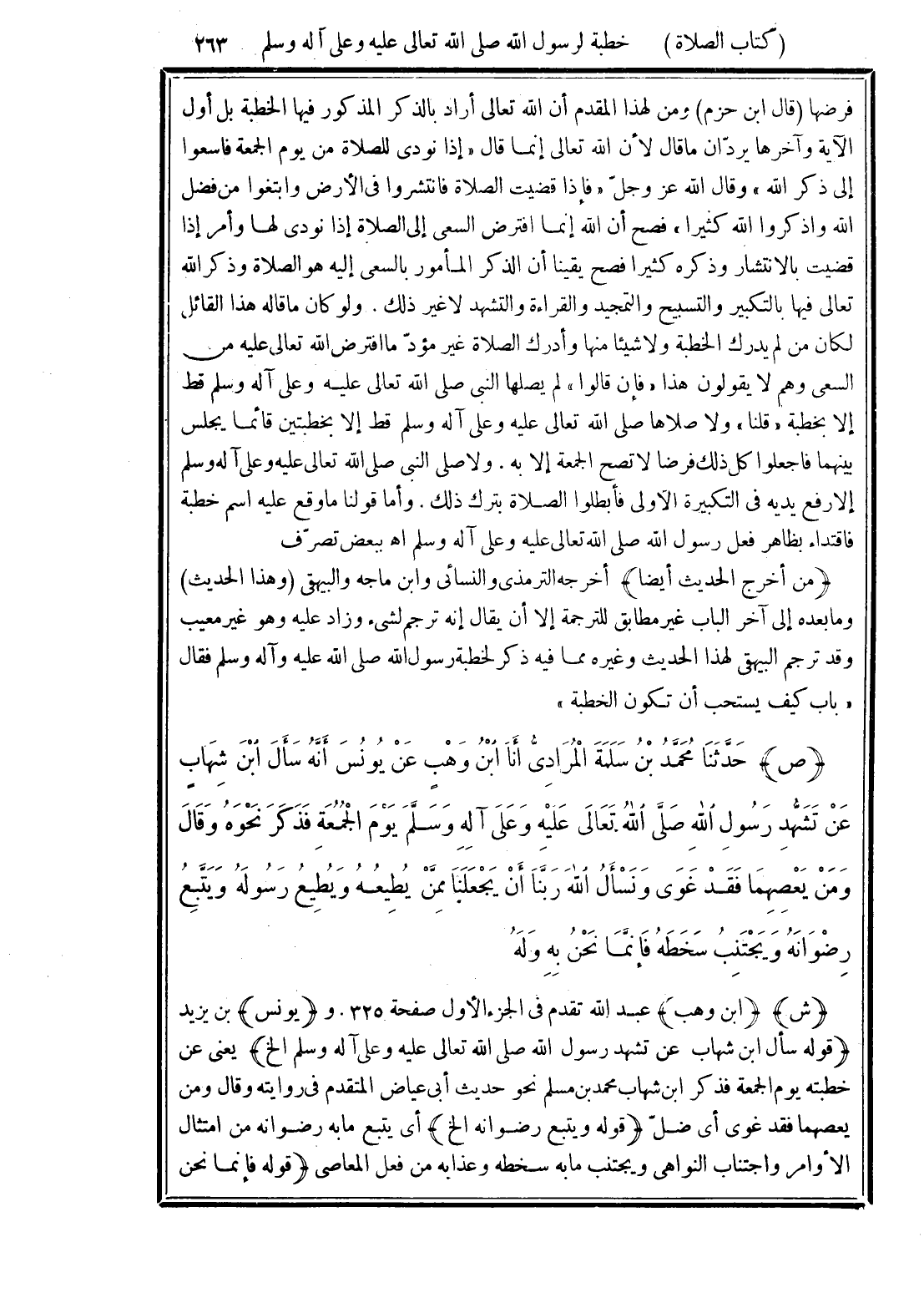 (ص) حَدَّثَنَا مُحَمَّدُ بْنُ سَلَمَةَ الْمُرَادِيُّ أَنَا ابْنُ وَهْبٍ عَنْ يُونُسَ أَنَّهُ سَأَلَ ابْنَ شِهَابٍ عَنْ تَشَهُّدِ رَسُولِ اللهِ -صَلَّى الله تَعَالَى عَلَيْهِ وَعَلَى آلِهِ وَسَلَّمَ- يَوْمَ الْجُمُعَةِ فَذَكَرَ نَحْوَهُ قَالَ "وَمَنْ يَعْصِهِمَا فَقَدْ غَوَى". وَنَسْأَلُ اللهَ رَبَّنَا أَنْ يَجْعَلَنَا مِمَّنْ يُطِيعُهُ وَيُطِيعُ رَسُولَهُ وَيَتَّبِعُ رِضْوَانَهُ وَيَجْتَنِبُ سَخَطَهُ فَإِنَّمَا نَحْنُ بِهِ وَلَهُ.
