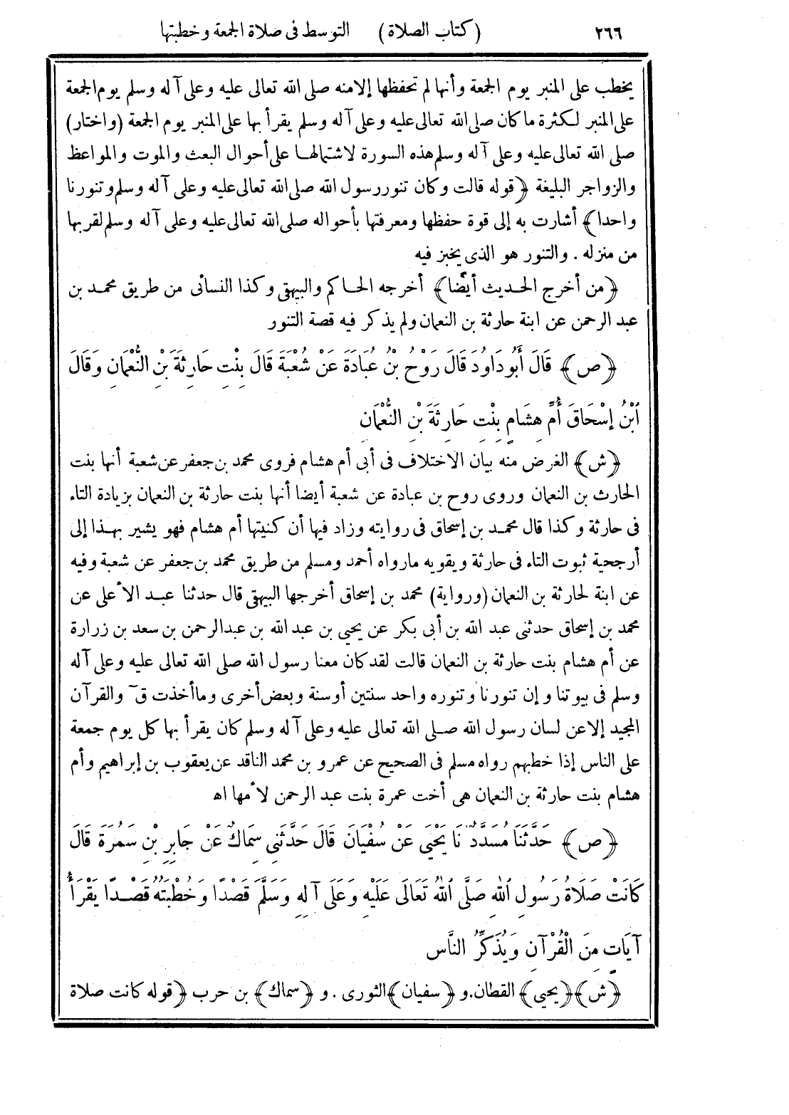 (ش) الغرض منه بيان الاختلاف في أبي أم هشام فروى محمَّد بن جعفر عن شعبة أنه ابن ت الحارث بن النعمان وروى روح بن عبادة عن شعبة أيضًا أنه ابن ت حارثة بن النعمان بزيادة التاء في حارثة وكذا قال محمَّد بن إسحاق في روايته وزاد فيها أن كنيتها أم هشام فهو يشير بهذا إلى أرجحية ثبوت التاء في حارثة ويقويه ما رواه أحمد ومسلم من طريق محمَّد بن جعفر عن شعبة وفيه عن ابنة لحارثة بن النعمان (ورواية) محمَّد بن إسحاق أخرجها البيهقي قال حدثنا عبد الأعلي عن محمَّد بن إسحاق حدثني عبد الله بن أبي بكر عن يحيى بن عبد الله بن عبد الرحمن بن سعد بن زرارة عن أم هشام بنت حارثة بن النعمان قالت لقد كان معنا رسول الله صلى الله تعالى عليه وعلى آله وسلم في بيوتنا وإن تنورنا وتنوره واحد سنتين أوسنة وبعض أخري وما أخذت ق والقرآن المجيد إلى عن لسان رسول الله صلى الله تعالى عليه وعلى آله وسلم كان يقرأ بها كل يوم جمعة على الناس إذا خطبهم رواه مسلم في الصحيح عن عمرو بن محمَّد الناقد عن يعقوب بن إبراهيم وأم هشام بنت حارثة بن النعمان هي أخت عمرة بنت عبد الرحمن لأمها اهـ