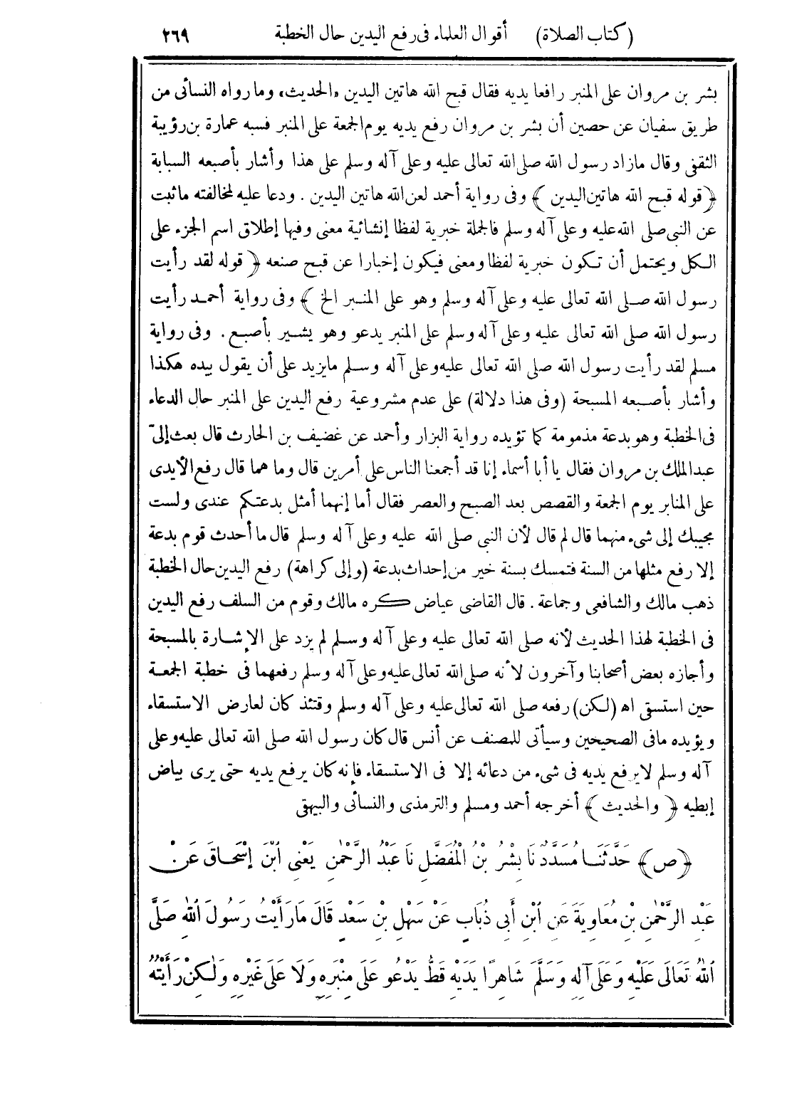 بشر بن مروان على المنبر رافعًا يديه فقال قبح الله هاتين اليدين "الحديث" وما رواه النسائي من طريق سفيان عن حصين أن بشر بن مروان رفع يديه يوم الجمعة على المنبر فسبه عارة بن رؤيبة الثقفي وقال ما زاد رسول الله صلى الله تعالى عليه وعلى آله وسلم على هذا وأشار بأصبعه السبابة