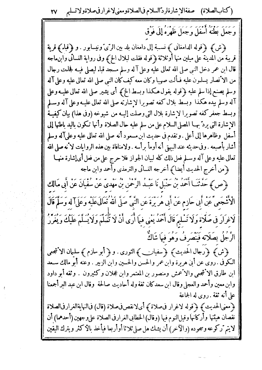 (ص) حَدَّثَنَا أَحْمَدُ بْنُ حَنْبَلٍ نَا عَبْدُ الرَّحْمَنِ بْنُ مَهْدِيٍّ عَنْ سُفْيَانَ عَنْ أَبِي مَالِكٍ الأَشْجَعِيِّ عَنْ أَبِي حَازِمٍ عَنْ أَبِي هُرَيْرَةَ عَنِ النَّبِيِّ -صلى الله عليه وسلم- قَالَ "لاَ غِرَارَ في صَلاَةٍ وَلاَ تَسْلِيمٍ". قَالَ أَحْمَدُ يَعْنِي فِيمَا أُرَى أَنْ لاَ تُسَلِّمَ وَلاَ يُسَلَّمَ عَلَيْكَ وَيُغَرِّرُ الرَّجُلُ بِصَلاَتِهِ فَيَنْصَرِفُ وَهُوَ فِيهَا شَاكٌّ.