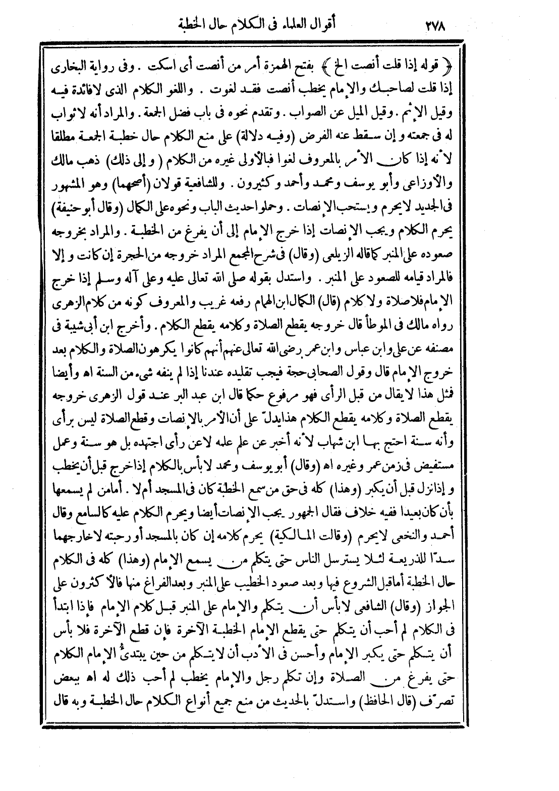 (وقال) أبو يوسف ومحمد لا بأس بالكلام إذا خرج قبل أن يخطب وإذا نزل قبل أن يكبر (وهذا) كله في حق من سمع الخطبة كان في المسجد أم لا. أما من لم يسمعها بأن كان بعيدًا ففيه خلاف فقال الجمهور يجب الإنصات أيضًا ويحرم الكلام عليه كالسامع وقال أحمد والنخعي لا يحرم (وقالت المالكية) يحرم كلامه إن كان بالمسجد أو رحبته لا خارجهما سدًّا للذريعة لئلا يسترسل الناس حتى يتكلم من يسمع الإِمام (وهذا) كله في الكلام حال الخطبة أما قبل الشروع فيها وبعد صعود الخطيب على المنبر وبعد الفراغ منها فالأكثرون على الجواز (وقال) الشافعي لا بأس أن يتكلم والإمام على المنبر قبل كلام الإِمام فإذا ابتدأ في الكلام لم أحب أن يتكلم حتى يقطع الإِمام الخطبة الآخرة كان قطع الآخرة فلا بأس أن يتكلم حتى يكبر الإِمام وأحسن في الأدب أن لا يتكلم من حين يبتدئُ الإِمام الكلام حتى يفرغ من الصلاة وإن تكلم رجل والإمام يخطب لم أحب ذلك له اهـ ببعض تصرّف