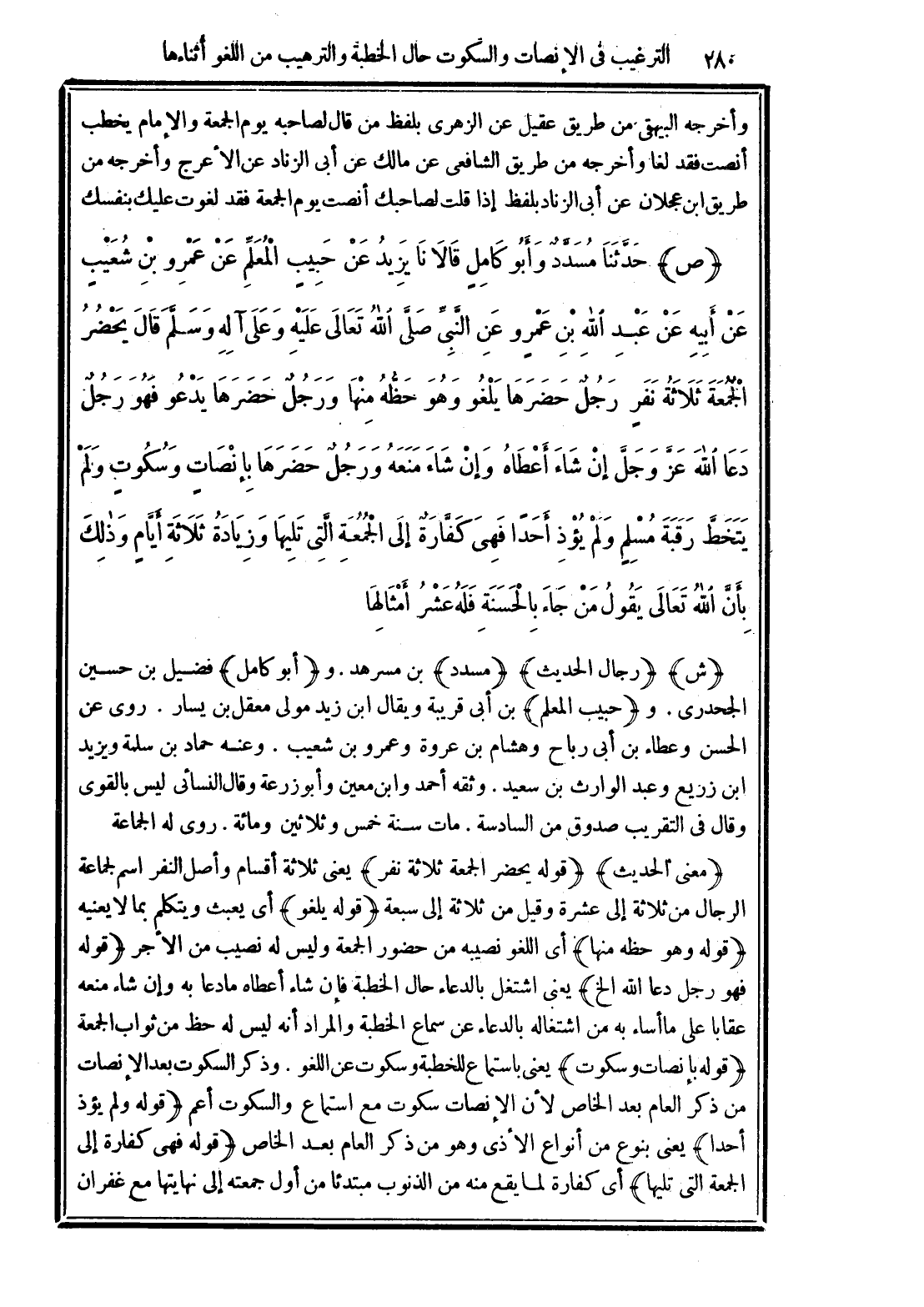 (ص) حَدَّثَنَا مُسَدَّدٌ وَأَبُو كَامِلٍ قَالاَ نَا يَزِيدُ عَنْ حَبِيبٍ الْمُعَلِّمِ عَنْ عَمْرِو بْنِ شُعَيْبٍ عَنْ أَبِيهِ عَنْ عَبْدِ اللهِ بْنِ عَمْرٍو عَنِ النَّبِيِّ -صَلَّى الله تَعَالَى عَلَيْهِ وَعَلَى آلِهِ وَسَلَّمَ- قَالَ "يَحْضُرُ الْجُمُعَةَ ثَلاَثَةُ نَفَرٍ رَجُلٌ حَضَرَهَا يَلْغُو وَهُوَ حَظُّهُ مِنْهَا وَرَجُلٌ حَضَرَهَا يَدْعُو فَهُوَ رَجُلٌ دَعَا اللهَ عَزَّ وَجَلَّ إِنْ شَاءَ أَعْطَاهُ وَإِنْ شَاءَ مَنَعَهُ وَرَجُلٌ حَضَرَهَا بِإِنْصَاتٍ وَسُكُوتٍ وَلَمْ يَتَخَطَّ رَقَبَةَ مُسْلِمٍ وَلَمْ يُؤْذِ أَحَدًا فَهِىَ كَفَّارَةٌ إِلَى الْجُمُعَةِ الَّتِى تَلِيهَا وَزِيَادَةُ ثَلاَثَةِ أَيَّامٍ وَذَلِكَ بِأَنَّ اللهَ عَزَّ وَجَلَّ يَقُولُ (مَنْ جَاءَ بِالْحَسَنَةِ فَلَهُ عَشْرُ أَمْثَالِهَا) ".