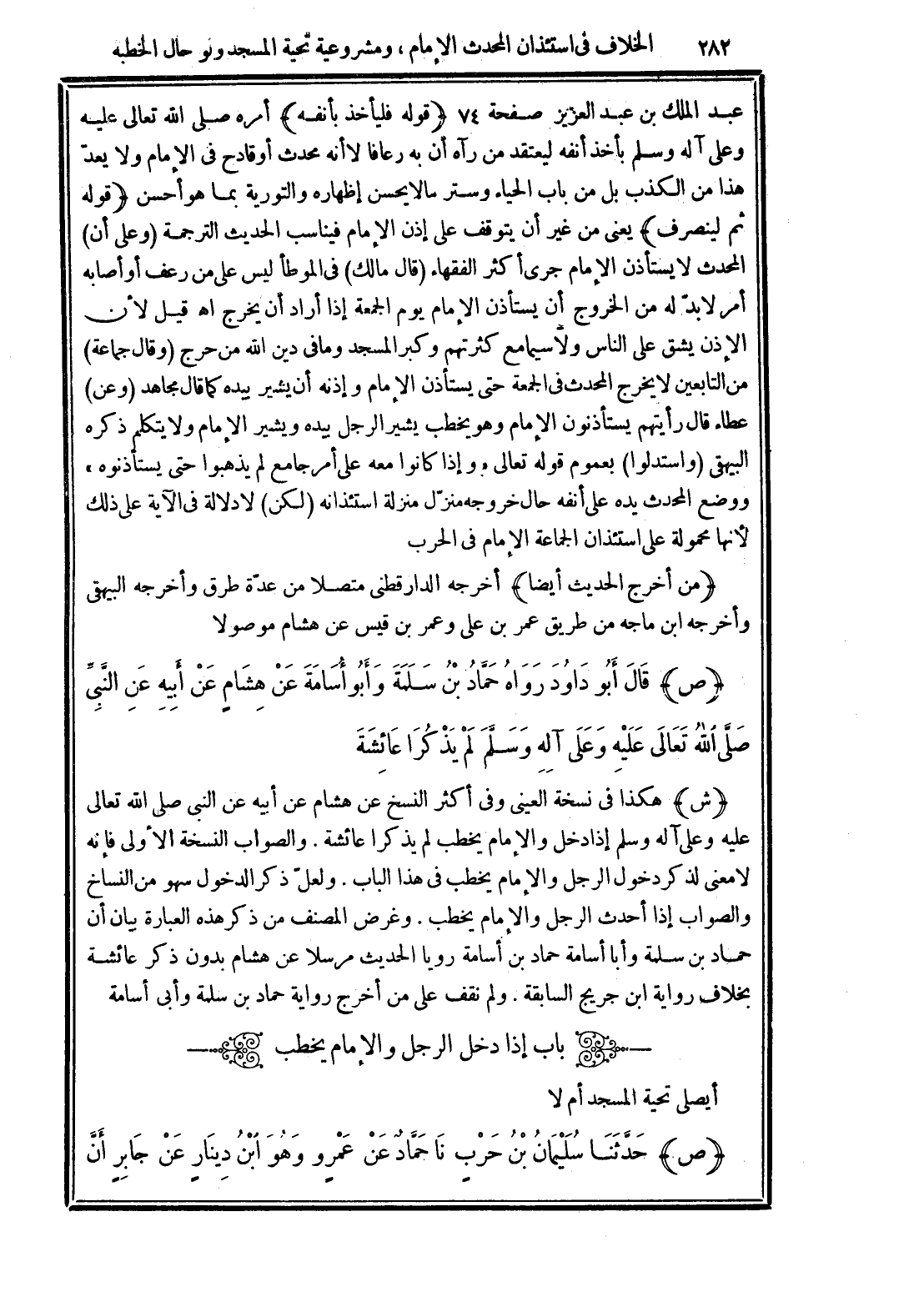 (ش) هكذا في نسخة العيني وفي أكثر النسخ عن هشام عن أبيه عن النبي صلى الله تعالى عليه وعلى آله وسلم إذا دخل والإمام يخطب لم يذكرا عائشة. والصواب النسخة الأولى فإنه لا معنى لذكر دخول الرجل والإمام يخطب في هذا الباب. ولعلّ ذكر الدخول سهو من النساخ والصواب إذا أحدث الرجل والإمام يخطب. وغرض المصنف من ذكر هذه العبارة بيان أن حماد بن سلمة وأبا أسامة حماد بن أسامة رويا الحديث مرسلًا عن هشام بدون ذكر عائشة بخلاف رواية ابن جريج السابقة. ولم نقف على من أخرج رواية حماد بن سلمة وأبي أسامة