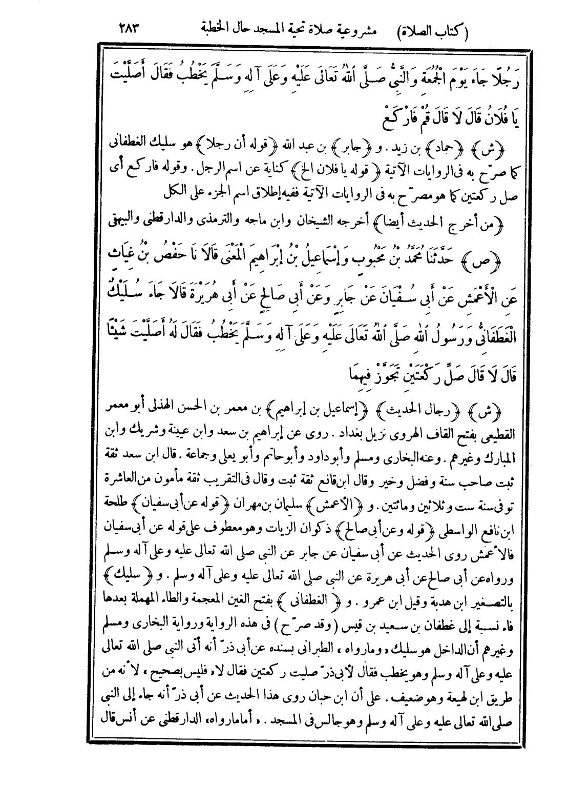 رَجُلًا جَاءَ يَوْمَ الْجُمُعَةِ وَالنَّبِيُّ -صَلَّى الله تَعَالَى عَلَيْهِ وَعَلَى آلِهِ وَسَلَّمَ- يَخْطُبُ فَقَالَ "أَصَلَّيْتَ يَا فُلاَنُ". قَالَ لاَ. قَالَ "قُمْ فَارْكَعْ".
