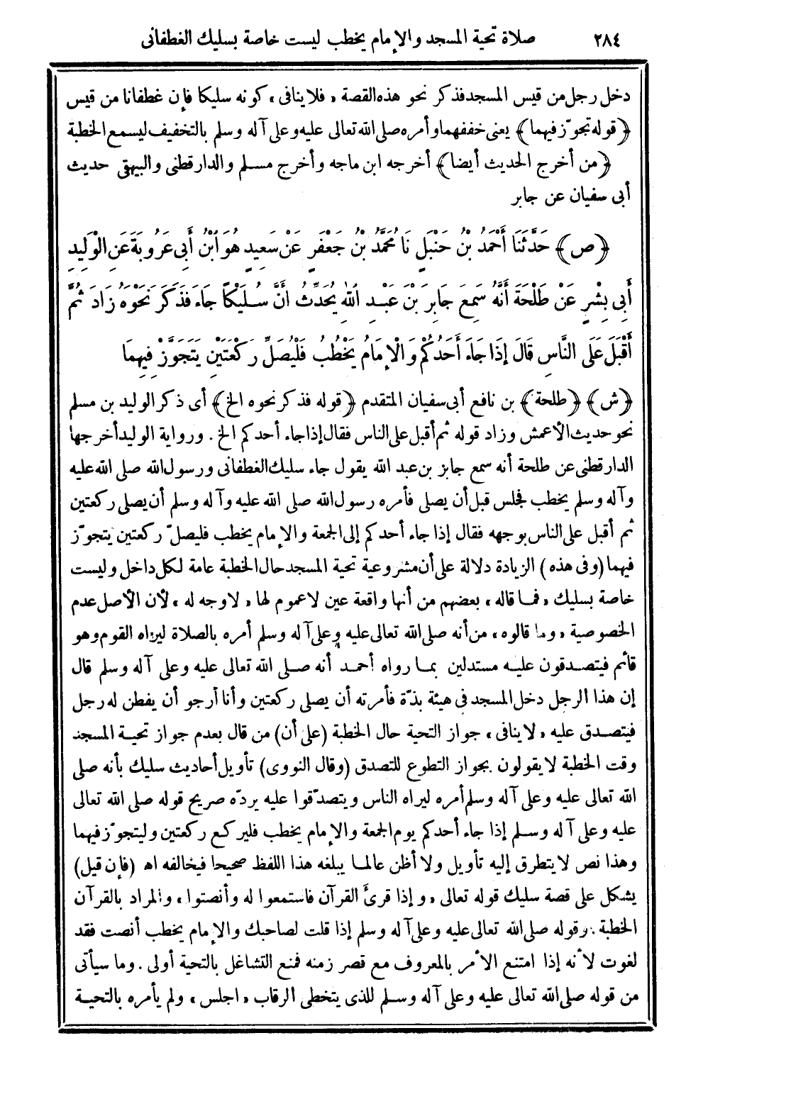 (قوله فذكر نحوه الخ) أي ذكر الوليد بن مسلم نحو حديث الأعمش وزاد قوله ثم أقبل على الناس فقال إذا جاء أحدكم الخ. ورواية الوليد أخرجها الدارقطني عن طلحة أنه سمع جابر بن عبد الله يقول جاء سليك الغطفاني ورسول الله صلى الله عليه وآله وسلم يخطب فجلس قبل أن يصلي فأمره رسول الله صلى الله عليه وآله وسلم أن يصلي ركعتين ثم أقبل على الناس بوجهه فقال إذا جاء أحدكم إلى الجمعة والإمام يخطب فليصلّ ركعتين يتجوّز فيهما (وفي هذه) الزيادة دلالة على أن مشروعية تحية المسجد حال الخطبة عامة لكل داخل وليست خاصة بسليك "فما قاله" بعضهم من أنها واقعة عين لا عموم لها "لا وجه له" لأن الأصل عدم الخصوصية "وما قالوه" من أنه صلى الله تعالى عليه وعلى آله وسلم أمره بالصلاة ليراه القوم وهو قائم فيتصدقون عليه مستدلين بما رواه أحمد أنه صلى الله تعالى عليه وعلى آله وسلم قال إن هذا الرجل دخل المسجد في هيئة بذّة فأمرته أن يصلي ركعتين وأنا أرجو أن يفطن له رجل فيتصدق عليه "لا ينافي" جواز التحية حال الخطبة (على أن) من قال بعدم جواز تحية المسجد وقت الخطبة لا يقولون. بجواز التطوع للتصدق (وقال النووي) تأويل أحاديث سليك بأنه صلى الله تعالى عليه وعلى آله وسلم أمره ليراه الناس ويتصدّقوا عليه يردّه صريح قوله صلى الله تعالى عليه وعلى آله وسلم إذا جاء أحدكم يوم الجمعة والإمام يخطب فليركع ركعتين وليتجوّز فيهما وهذا نص لا يتطرق إليه تأويل ولا أظن عالمًا يبلغه هذا اللفظ صحيحًا فيخالفه اهـ