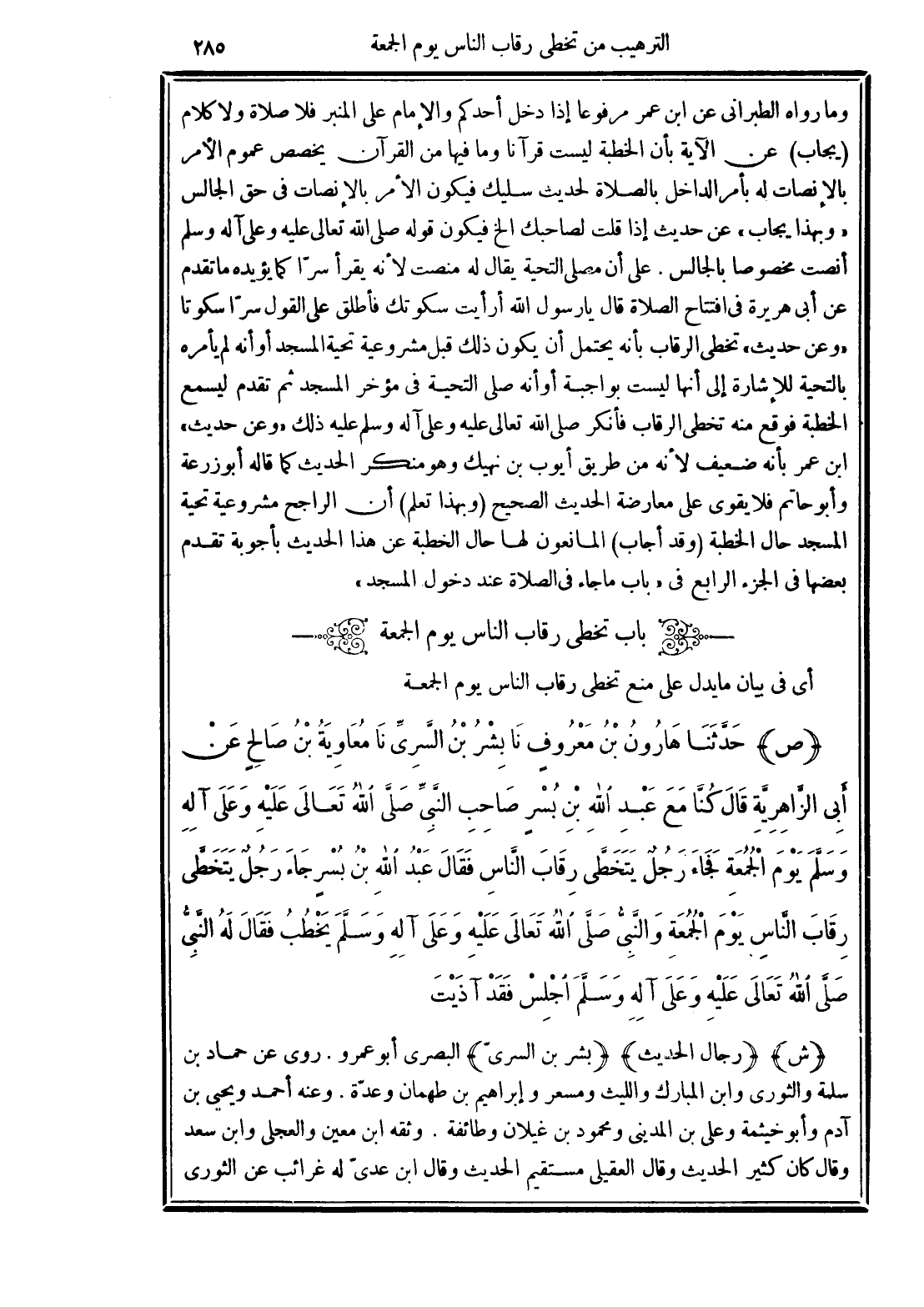 (ص) حَدَّثَنَا هَارُونُ بْنُ مَعْرُوفٍ نَا بِشْرُ بْنُ السَّرِيِّ نَا مُعَاوِيَةُ بْنُ صَالِحٍ عَنْ أَبِي الزَّاهِرِيَّةِ قَالَ كُنَّا مَعَ عَبْدِ اللهِ بْنِ بُسْرٍ صَاحِبِ النَّبِيِّ -صَلَّى الله تَعَالَى عَلَيْهِ وَعَلَى آلِهِ وَسَلَّمَ- يَوْمَ الْجُمُعَةِ فَجَاءَ رَجُلٌ يَتَخَطَّى رِقَابَ النَّاسِ فَقَالَ عَبْدُ اللهِ بْنُ بُسْرٍ جَاءَ رَجُلٌ يَتَخَطَّى رِقَابَ النَّاسِ يَوْمَ الْجُمُعَةِ وَالنَّبِيُّ -صَلَّى الله تَعَالَى عَلَيْهِ وَعَلَى آلِهِ وَسَلَّمَ- يَخْطُبُ فَقَالَ لَهُ النَّبِيُّ -صَلَّى الله تَعَالَى عَلَيْهِ وَعَلَى آلِهِ وَسَلَّمَ- "اجْلِسْ فَقَدْ آذَيْتَ".