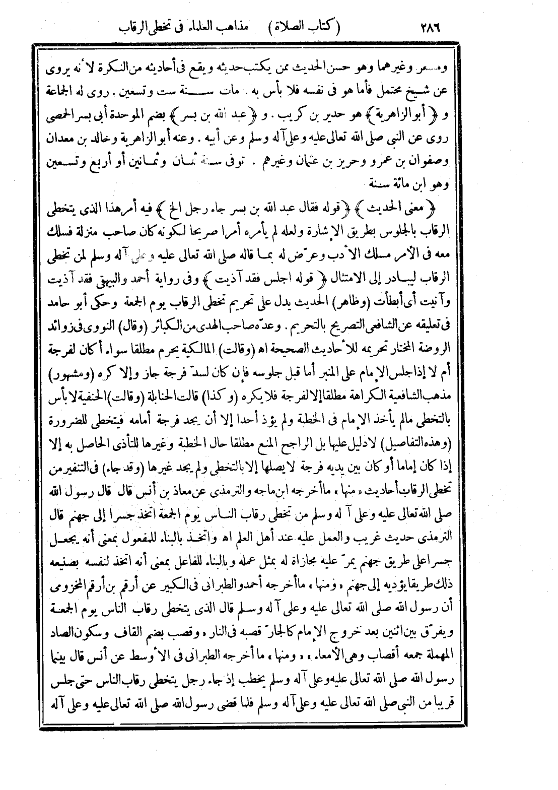 (وقالت) الحنفية لا بأس بالتخطى ما لم يأخذ الإِمام في الخطبة ولم يؤذ أحدًا إلا أن يجد فرجة أمامه فيتخطى للضرورة (وهذه التفاصيل) لا دليل عليها بل الراجح المنع مطلقًا حال الخطبة وغيرها للتأذي الحاصل به إلا إذا كان إمامًا أو كان بين يديه فرجة لا يصلها إلا بالتخطي ولم يجد غيرها (وقد جاء) في التنفير من تخطي الرقاب أحاديث "منها" ما أخرجه ابن ماجه والترمذي عن معاذ بن أنس قال قال رسول الله صلى الله تعالى عليه وعلى آله وسلم من تخطى رقاب الناس يوم الجمعة اتخذ جسرًا إلى جهنم قال الترمذي حديث غريب والعمل عليه عند أهل العلم اهـ