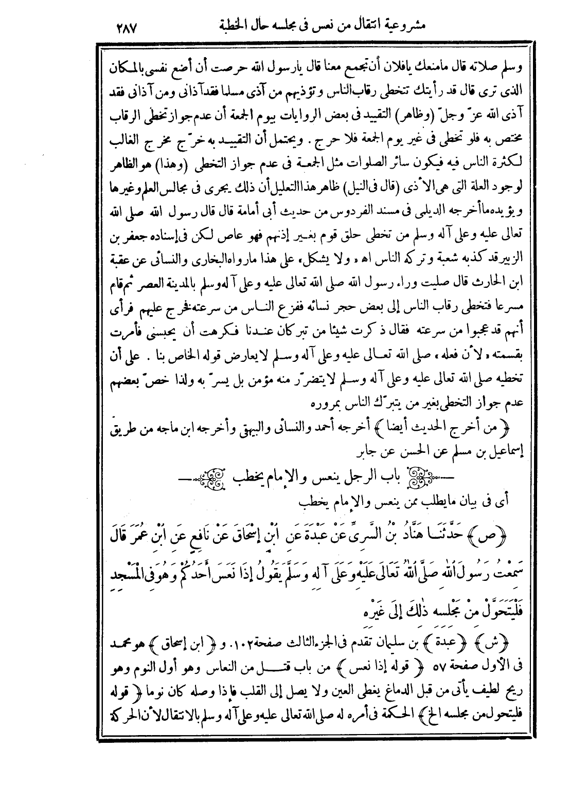 "ولا يشكل" على هذا ما رواه البخاري والنسائي عن عقبة ابن الحارث قال صليت وراء رسول الله صلى الله تعالى عليه وعلى آله وسلم بالمدينة العصر ثم قام مسرعًا فتخطى رقاب الناس إلى بعض حجر نسائه ففزع الناس من سرعته فخرج عليهم فرأى أنهم قد عجبوا من سرعته فقال ذكرت شيئًا من تبر كان عندنا فكرهت أن يحبسنى فأمرت بقسمته "لأن فعله" صلى الله تعالى عليه وعلى آله وسلم لا يعارض قوله الخاص بنا. على أن تخطيه صلى الله تعالى عليه وعلى آله وسلم لا يتضرّر منة مؤمن بل يسرّ به ولذا خصّ بعضهم عدم جواز التخطي بغير من يتبرّك الناس بمروره