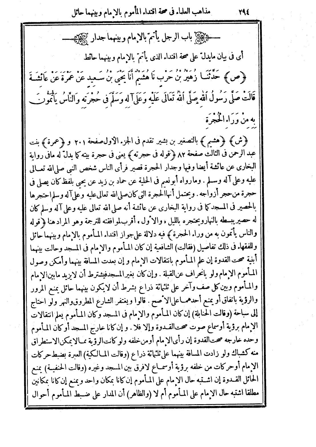 (ص) حَدَّثَنَا زُهَيْرُ بْنُ حَرْبٍ نَا هُشَيْمٌ أَنَا يَحْيَى بْنُ سَعِيدٍ عَنْ عَمْرَةَ عَنْ عَائِشَةَ قَالَتْ صَلَّى رَسُولُ اللَّهِ -صَلَّى الله تَعَالَى عَلَيْهِ وَعَلَى آلِهِ وَسَلَّمَ- فِى حُجْرَتِهِ وَالنَّاسُ يَأْتَمُّونَ بِهِ مِنْ وَرَاءِ الْحُجْرَةِ.