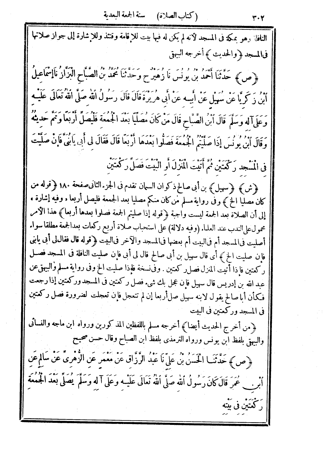 (ص) حَدَّثَنَا أَحْمَدُ بْنُ يُونُسَ نَا زُهَيْرٌ ح وَنَا مُحَمَّدُ بْنُ الصَّبَّاحِ الْبَزَّازُ نَا إِسْمَاعِيلُ بْنُ زَكَرِيَّا عَنْ سُهَيْلٍ عَنْ أَبِيهِ عَنْ أَبِي هُرَيْرَةَ قَالَ قَالَ رَسُولُ اللهِ -صَلَّى الله تَعَالَى عَلَيْهِ وَعَلَى آلِهِ وَسَلَّمَ-قَالَ ابْنُ الصَّبَّاحِ قَالَ- "مَنْ كَانَ مُصَلِّيًا بَعْدَ الْجُمُعَةِ فَلْيُصَلِّ أَرْبَعًا". وَتَمَّ حَدِيثُهُ وَقَالَ ابْنُ يُونُسَ "إِذَا صَلَّيْتُمُ الْجُمُعَةَ فَصَلُّوا بَعْدَهَا أَرْبَعًا". قَالَ فَقَالَ لِي أَبِي يَا بُنَيَّ فَإِنْ صَلَّيْتَ في الْمَسْجِدِ رَكْعَتَيْنِ ثُمَّ أَتَيْتَ الْمَنْزِلَ أَوِ الْبَيْتَ فَصَلِّ رَكْعَتَيْنِ".