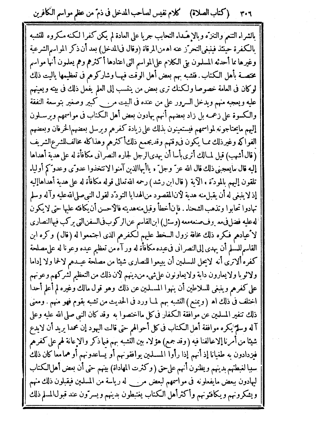 (وقال في المدخل) بعد أن ذكر المواسم الشرعية وغيرها مما أحدثه المسلمون بقي الكلام على المواسم التي اعتادها أكثرهم وهم يعلمون أنها مواسم مختصة بأهل الكتاب. فتشبه بهم بعض أهل الوقت فيها وشاركوهم في تعظيمها يا ليت ذلك لو كان في العامة خصوصًا ولكنك ترى بعض من ينتسب إلى العلم يفعل ذلك في بيته ويعينهم عليه ويعجبه منهم ويدخل السرور على من عنده في البيت من كبير وصغير بتوسعة النفقة والكسوة على زعمه بل زاد بعضهم أنهم يهادون بعض أهل الكتاب في مواسمهم ويرسلون إليهم ما يحتاجونه. لمواسمهم فيستعينون بذلك على زيادة كفرهم ويرسل بعضهم الخرفان وبعضهم الفواكه وغير ذلك مما يكون في وقتهم وقد يجمع ذلك أكثرهم وهذا كله مخالف للشرع الشريف