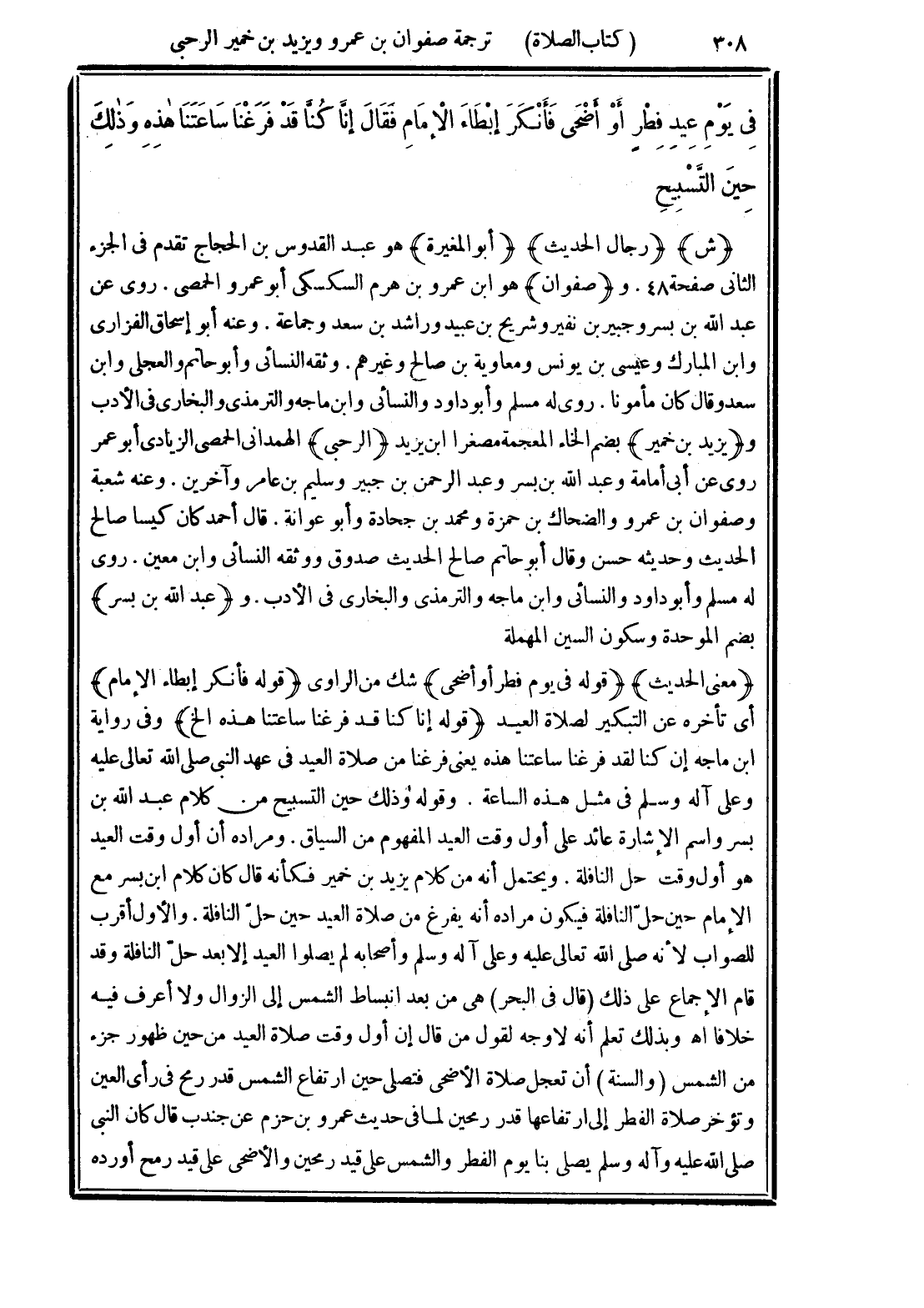 (قوله إنا كنا قد فرغنا ساعتنا هذه الخ) وفي رواية ابن ماجه إن كنا لقد فرغنا ساعتنا هذه يعني فرغنا من صلاة العيد في عهد النبي صلى الله تعالى عليه وعلى آله وسلم في مثل هذه الساعة. وقوله وذلك حين التسبيح من عبد الله بن بسر واسم الإشارة عائد على أول وقت العيد المفهوم من السياق. ومراده أن أول وقت العيد هو أول وقت حل النافلة. ويحتمل أنه من كلام يزيد بن خمير فكأنه قال كان كلام ابن بسر مع الإِمام حين حلّ النافلة فيكون مراده أنه يفرغ من صلاة العيد حين حلّ النافلة. والأول أقرب للصواب لأنه صلى الله تعالى عليه وعلى آله وسلم وأصحابه لم يصلوا العيد إلا بعد حلّ النافلة وقد قام الإجماع على ذلك
