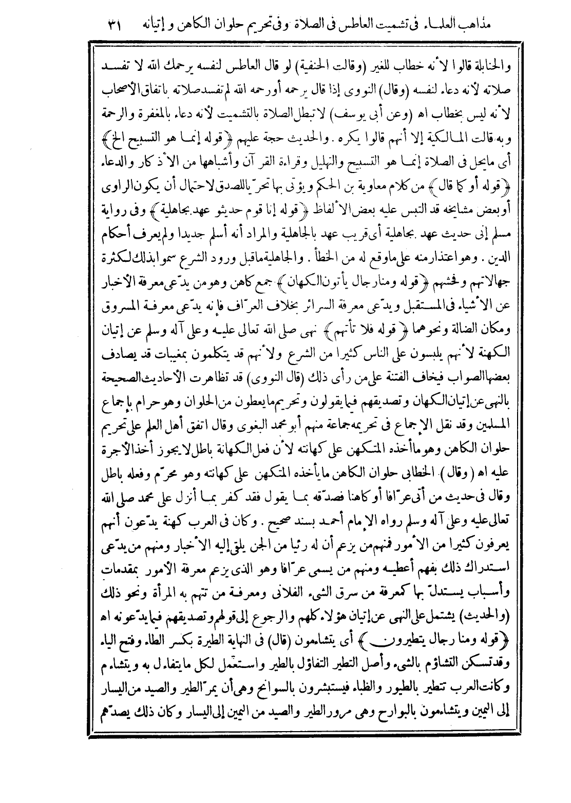 (قال النووي) قد تظاهرت الأحاديث الصحيحة بالنهى عن إتيان الكهان وتصديقهم فيما يقولون وتحريم ما يعطون من الحلوان وهو حرام بإجماع المسلمين وقد نقل الإجماع في تحريمه جماعة منهم أبو محمد البغوي وقال اتفق أهل العلم على تحريم حلوان الكاهن وهو ما أخذه المتكهن على كهانته لأن فعل الكهانة باطل لا يجوز أخد الأجرة عليه اهـ