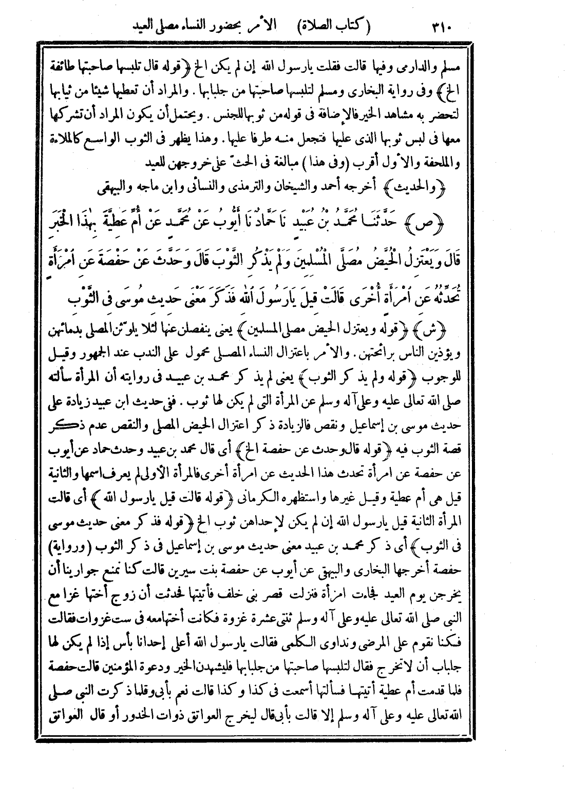 (ص) حَدَّثَنَا مُحَمَّدُ بْنُ عُبَيْدٍ نَا حَمَّادٌ نَا أَيُّوبُ عَنْ مُحَمَّدٍ عَنْ أُمِّ عَطِيَّةَ بِهَذَا الْخَبَرِ قَالَ "وَيَعْتَزِلُ الْحُيَّضُ مُصَلَّى الْمُسْلِمِينَ". وَلَمْ يَذْكُرِ الثَّوْبَ. قَالَ وَحَدَّثَ عَنْ حَفْصَةَ عَنِ امْرَأَةٍ تُحَدِّثُهُ عَنِ امْرَأَةٍ أُخْرَى قَالَتْ قِيلَ يَا رَسُولَ اللهِ فَذَكَرَ مَعْنَى حَدِيثِ مُوسَى في الثَّوْبِ.