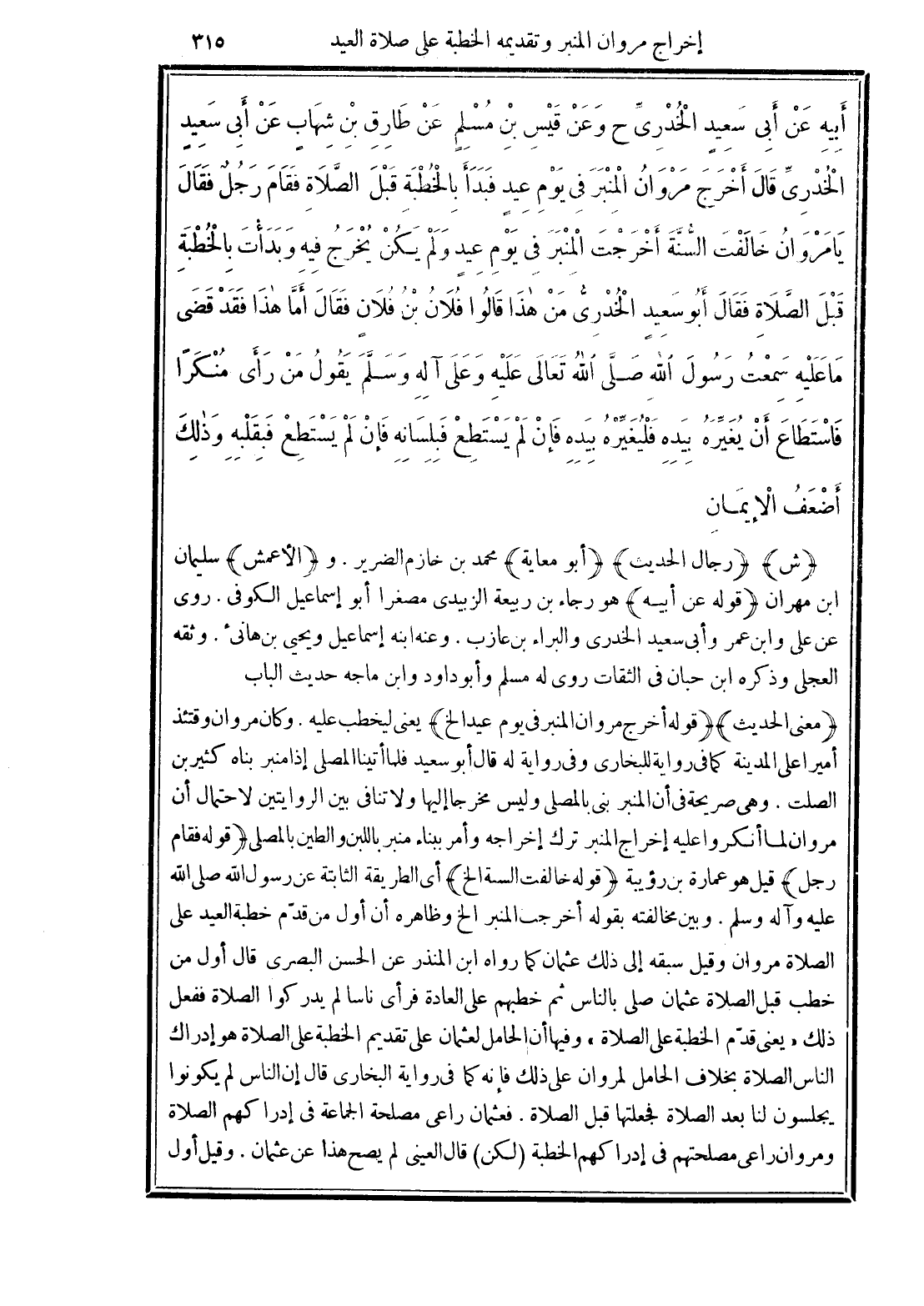 أَبِيهِ عَنْ أَبِي سَعِيدٍ الْخُدْرِيِّ ح وَعَنْ قَيْسِ بْنِ مُسْلِمٍ عَنْ طَارِقِ بْنِ شِهَابٍ عَنْ أَبِي سَعِيدٍ الْخُدْرِيِّ قَالَ أَخْرَجَ مَرْوَانُ الْمِنْبَرَ في يَوْمِ عِيدٍ فَبَدَأَ بِالْخُطْبَةِ قَبْلَ الصَّلاَةِ فَقَامَ رَجُلٌ فَقَالَ يَا مَرْوَانُ خَالَفْتَ السُّنَّةَ أَخْرَجْتَ الْمِنْبَرَ في يَوْمِ عِيدٍ وَلَمْ يَكُنْ يُخْرَجُ فِيهِ وَبَدَأْتَ بِالْخُطْبَةِ قَبْلَ الصَّلاَةِ. فَقَالَ أَبُو سَعِيدٍ الْخُدْرِيُّ مَنْ هَذَا قَالُوا فُلاَنُ بْنُ فُلاَنٍ. فَقَالَ أَمَّا هَذَا فَقَدْ قَضَى مَا عَلَيْهِ سَمِعْتُ رَسُولَ اللهِ -صَلَّى الله تَعَالَى عَلَيْهِ وَعَلَى آلِهِ وَسَلَّمَ- يَقُولُ "مَنْ رَأَى مُنْكَرًا فَاسْتَطَاعَ أَنْ يُغَيِّرَهُ بِيَدِهِ فَلْيُغَيِّرْهُ بِيَدِهِ فَإِنْ لَمْ يَسْتَطِعْ فَبِلِسَانِهِ فَإِنْ لَمْ يَسْتَطِعْ فَبِقَلْبِهِ وَذَلِكَ أَضْعَفُ الإِيمَانِ".