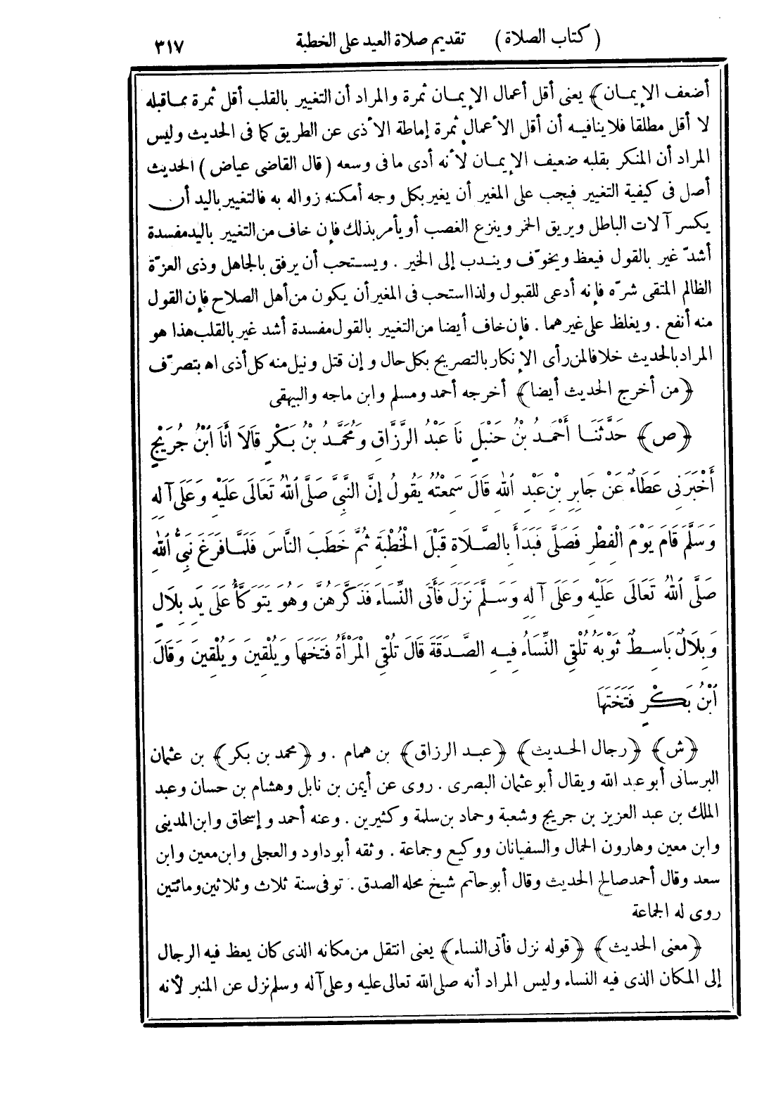 (ص) حَدَّثَنَا أَحْمَدُ بْنُ حَنْبَلٍ نَا عَبْدُ الرَّزَّاقِ وَمُحَمَّدُ بْنُ بَكْرٍ قَالاَ أَنَا ابْنُ جُرَيْجٍ أَخْبَرَنِي عَطَاءٌ عَنْ جَابِرِ بْنِ عَبْدِ اللَّهِ قَالَ سَمِعْتُهُ يَقُولُ إِنَّ النَّبِيَّ -صَلَّى الله تَعَالَى عَلَيْهِ وَعَلَى آلِهِ وَسَلَّمَ- قَامَ يَوْمَ الْفِطْرِ فَصَلَّى فَبَدَأَ بِالصَّلاَةِ قَبْلَ الْخُطْبَةِ ثُمَّ خَطَبَ النَّاسَ فَلَمَّا فَرَغَ نَبِيُّ اللَّهِ -صَلَّى الله تَعَالَى عَلَيْهِ وَعَلَى آلِهِ وَسَلَّمَ- نَزَلَ فَأَتَى النِّسَاءَ فَذَكَّرَهُنَّ وَهُوَ يَتَوَكَّأُ عَلَى يَدِ بِلاَلٍ وَبِلاَلٌ بَاسِطٌ ثَوْبَهُ تُلْقِي فِيهِ النِّسَاءُ الصَّدَقَةَ قَالَ تُلْقِي الْمَرْأَةُ فَتَخَهَا وَيُلْقِينَ وَيُلْقِينَ وَقَالَ ابْنُ بَكْرٍ فَتَخَتَهَا.