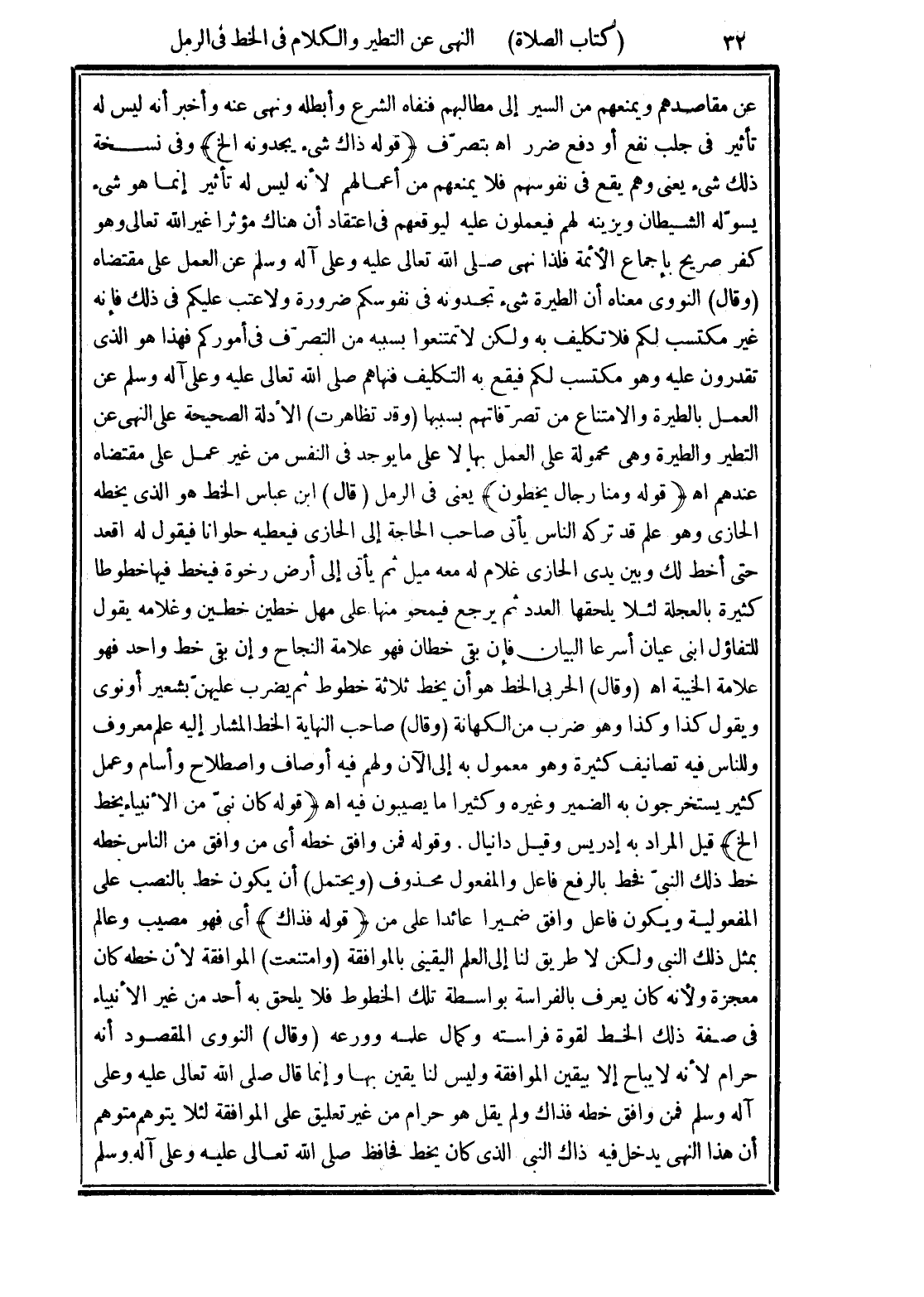 (وقال) النووي المقصود أنه حرام لأنه لا يباح إلا بيقين الموافقة وليس لنا يقين بها وإنما قال صلى الله تعالى عليه وعلى آله وسلم فمن وافق خطه فذاك ولم لقل هو حرام من غير تعليق على الموافقة لئلا يتوهم متوهم أن هذا النهى يدخل فيه ذاك النبي الذي كان يخط فحافظ صلى الله تعالى عليه وعلى آله وسلم