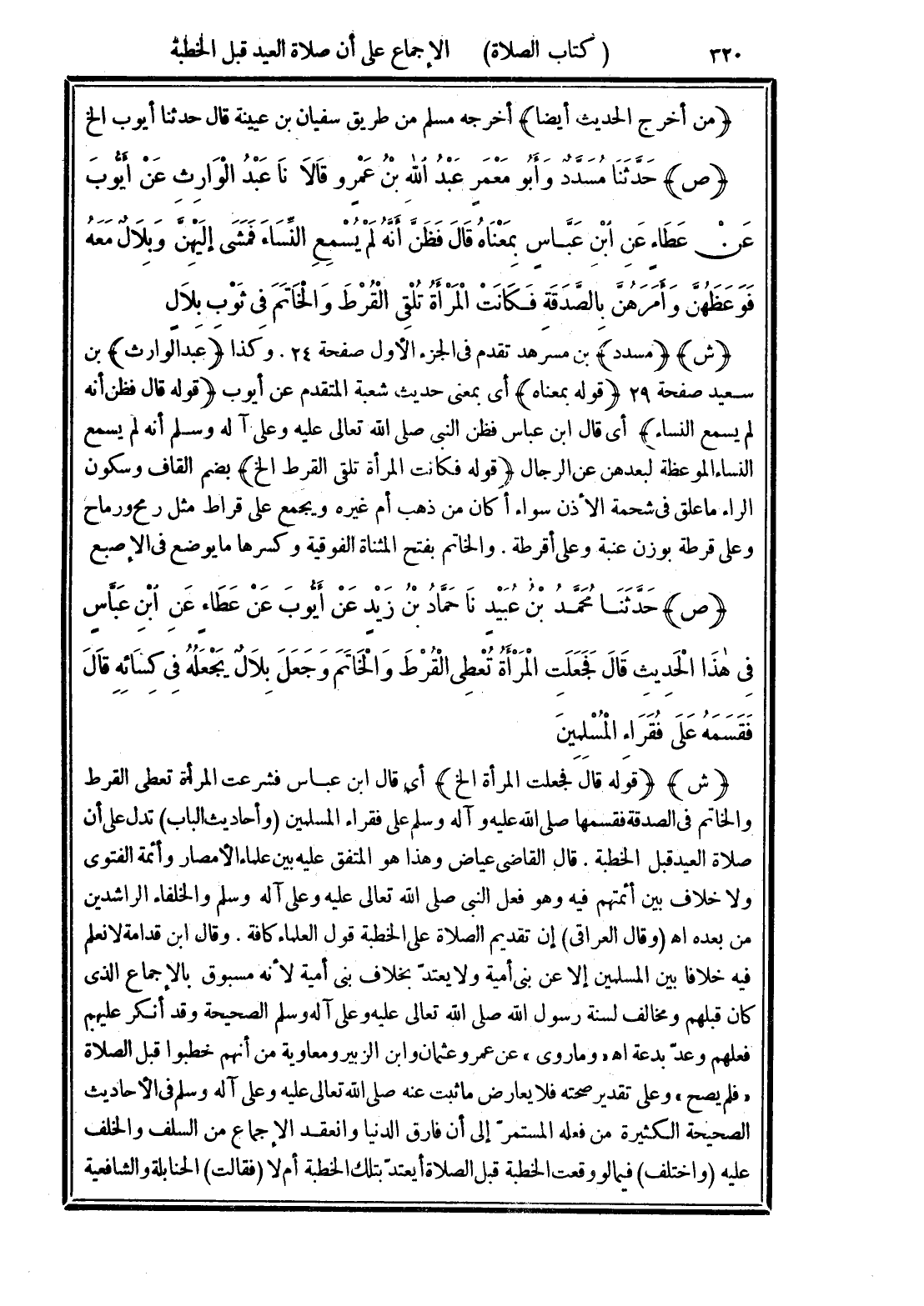 (وأحاديث الباب) تدل على أن صلاة العيد قبل الخطبة. قال القاضي عياض وهذا هو المتفق عليه بين علماء الأمصار وأئمة الفتوى ولا خلاف بين أئمتهم فيه وهو فعل النبي صلى الله تعالى عليه وعلى آله وسلم والخلفاء الراشدين من بعده اهـ