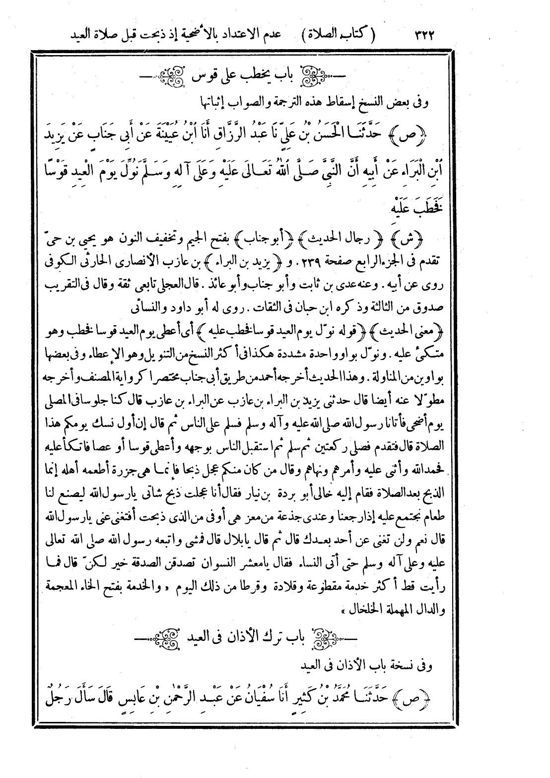 (ص) حَدَّثَنَا الْحَسَنُ بْنُ عَلِيٍّ نَا عَبْدُ الرَّزَّاقِ أَنَا ابْنُ عُيَيْنَةَ عَنْ أَبِي جَنَابٍ عَنْ يَزِيدَ بْنِ الْبَرَاءِ عَنْ أَبِيهِ أَنَّ النَّبِيَّ -صَلَّى الله تَعَالَى عَلَيْهِ وَعَلَى آلِهِ وَسَلَّمَ- نُوِّلَ يَوْمَ الْعِيدِ قَوْسًا فَخَطَبَ عَلَيْهِ.