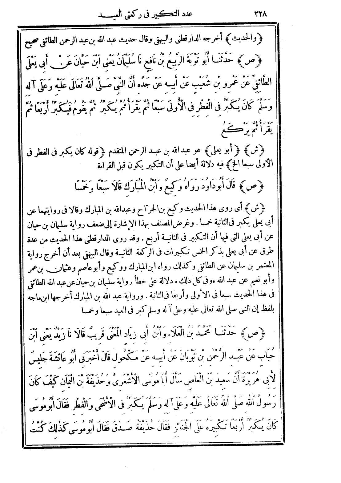 (ص) حَدَّثَنَا أَبُو تَوْبَةَ الرَّبِيعُ بْنُ نَافِعٍ نَا سُلَيْمَانُ -يَعْنِي ابْنَ حَيَّانَ- عَنْ أَبِي يَعْلَى الطَّائِفِيِّ عَنْ عَمْرِو بْنِ شُعَيْبٍ عَنْ أَبِيهِ عَنْ جَدِّهِ أَنَّ النَّبِيَّ -صَلَّى الله تَعَالَى عَلَيْهِ وَعَلَى آلِهِ وَسَلَّمَ- كَانَ يُكَبِّرُ فِي الْفِطْرِ فِي الأُولَى سَبْعًا ثُمَّ يَقْرَأُ ثُمَّ يُكَبِّرُ ثُمَّ يَقُومُ فَيُكَبِّرُ أَرْبَعًا ثُمَّ يَقْرَأُ ثُمَّ يَرْكَعُ.