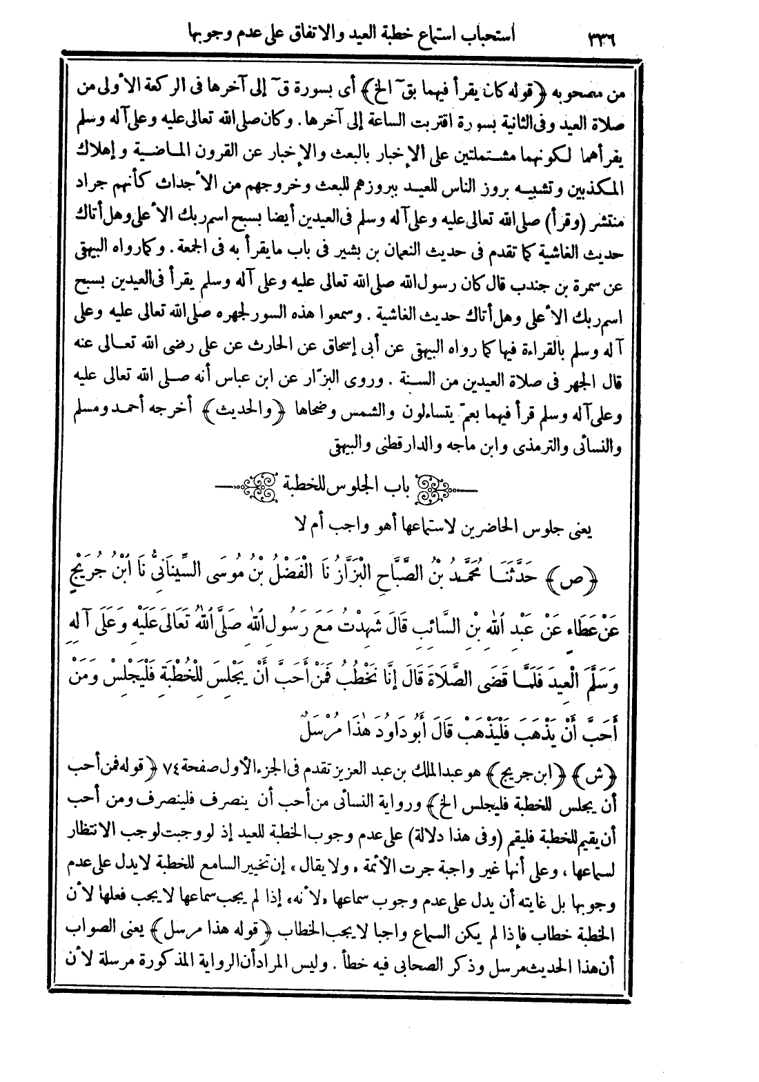 (وفي هذا دلالة) على عدم وجوب الخطبة للعيد إذ لو وجبت لوجب الانتظار لسماعها، وعلى أنها غير واجبة جرت الأئمة "ولا يقال" إن تخيير السامع للخطبة لا يدل على عدم وجوبها بل غايته أن يدل على عدم وجوب سماعها "لأنه" إذا لم يجب سماعها لا يجب فعلها لأن الخطبة خطاب فإذا لم يكن السماع واجبًا لا يجب الخطاب