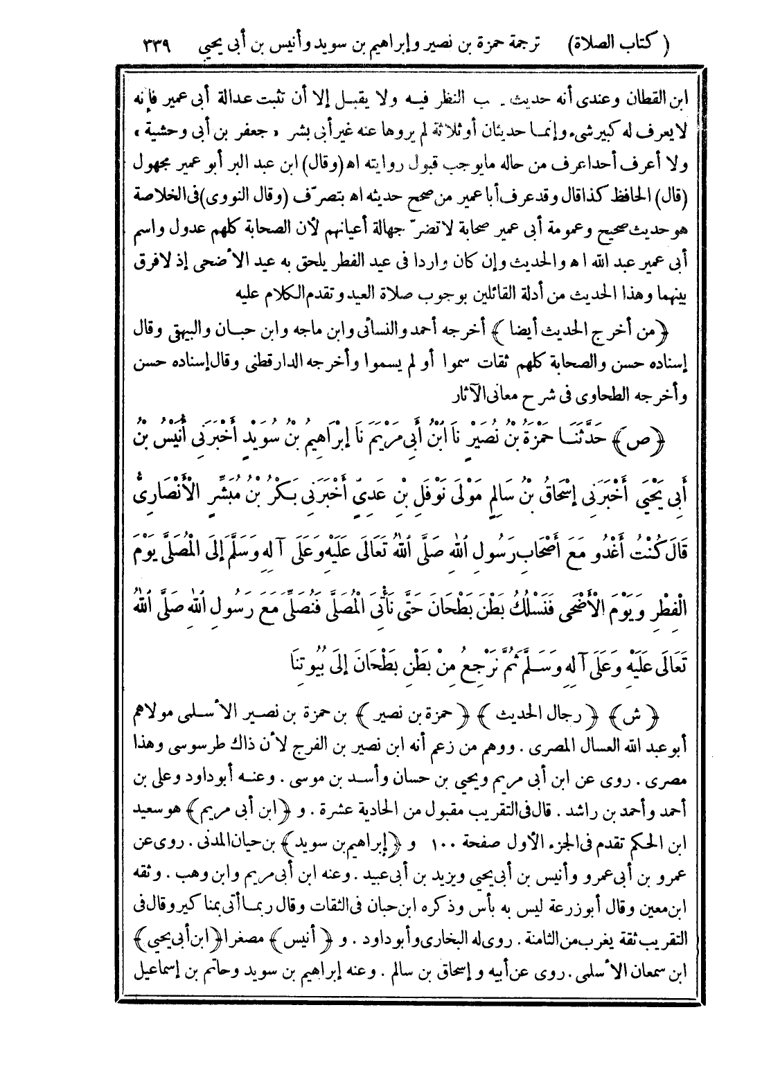 (ص) حَدَّثَنَا حَمْزَةُ بْنُ نُصَيْرٍ نَا ابْنُ أَبِي مَرْيَمَ نَا إِبْرَاهِيمُ بْنُ سُوَيْدٍ أَخْبَرَنِي أُنَيْسُ بْنُ أَبِي يَحْيَى أَخْبَرَنِي إِسْحَاقُ بْنُ سَالِمٍ مَوْلَى نَوْفَلِ بْنِ عَدِيٍّ أَخْبَرَنِي بَكْرُ بْنُ مُبَشِّرٍ الأَنْصَارِيُّ قَالَ كُنْتُ أَغْدُو مَعَ أَصْحَابِ رَسُولِ اللَّهِ -صَلَّى الله تَعَالَى عَلَيْهِ وَعَلَى آلِهِ وَسَلَّمَ- إِلَى الْمُصَلَّى يَوْمَ الْفِطْرِ وَيَوْمَ الأَضْحَى فَنَسْلُكُ بَطْنَ بَطْحَانَ حَتَّى نَأْتِىَ الْمُصَلَّى فَنُصَلِّيَ مَعَ رَسُولِ اللَّهِ -صَلَّى الله تَعَالَى عَلَيْهِ وَعَلَى آلِهِ وَسَلَّمَ- ثُمَّ نَرْجِعُ مِنْ بَطْنِ بَطْحَانَ إِلَى بُيُوتِنَا.