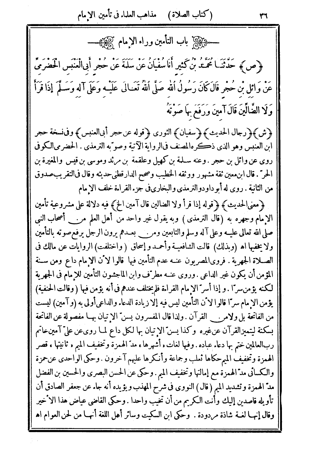 (ص) حَدَّثَنَا مُحَمَّدُ بْنُ كَثِيرٍ أَنَا سُفْيَانُ عَنْ سَلَمَةَ عَنْ حُجْرٍ أَبِي الْعَنْبَسِ الْحَضْرَمِيِّ عَنْ وَائِلِ بْنِ حُجْرٍ قَالَ كَانَ رَسُولُ اللهِ -صلى الله عليه وسلم- إِذَا قَرَأَ (وَلاَ الضَّالِّينَ) قَالَ "آمِينَ". وَرَفَعَ بِهَا صَوْتَهُ.