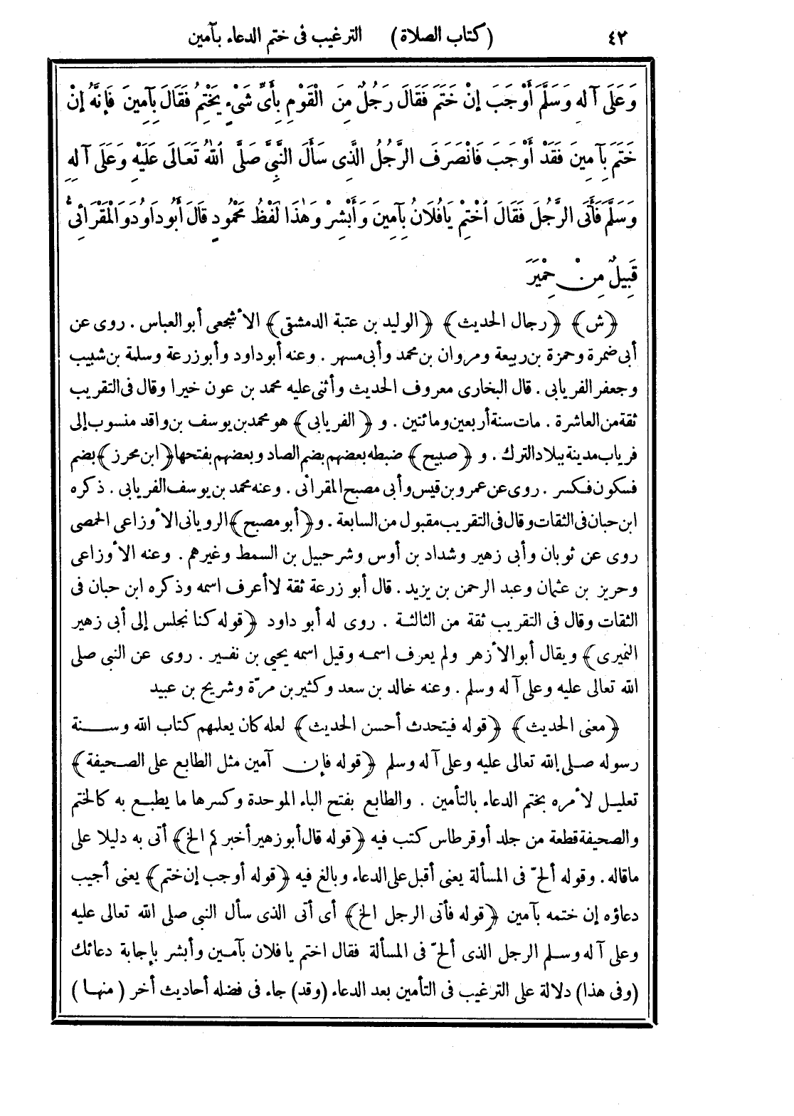 وعلى آله وسلم "أَوْجَبَ إِنْ خَتَمَ". فَقَالَ رَجُلٌ مِنَ الْقَوْمِ بِأَيِّ شَيءٍ يَخْتِمُ قَالَ "بِآمِينَ فَإِنَّهُ إِنْ خَتَمَ بِآمِينَ فَقَدْ أَوْجَبَ". فَانْصَرَفَ الرَّجُلُ الَّذِي سَأَلَ النَّبِيَّ -صلى الله عليه وسلم- فَأَتَى الرَّجُلَ فَقَالَ اخْتِمْ يَا فُلاَنُ بِآمِينَ وَأَبْشِرْ. وَهَذَا لَفْظُ مَحْمُودٍ. قَالَ أَبُو دَاوُدَ الْمَقْرَاءُ قَبِيلٌ مِنْ حِمْيَرَ.